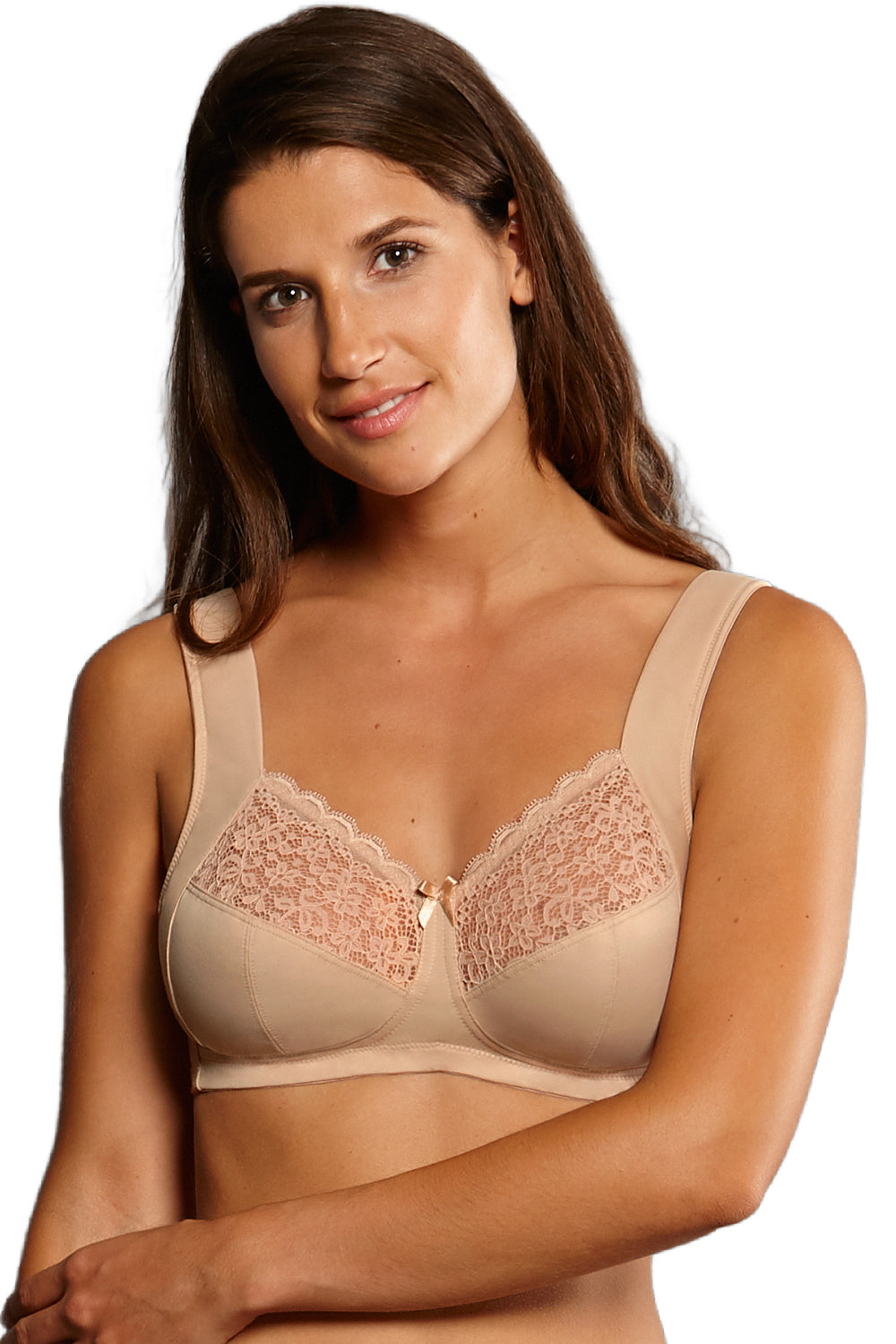 Sensual lace creates a modern retro look. This comfortable Anita Havanna wireless support bra in sand is not only an optical but also a functional highlight. This relieving soft bra without underwire takes the weight off your shoulders and helps to spread it evenly. The wide and soft cushioned straps prevent from cutting in and lay comfortably on your shoulders.