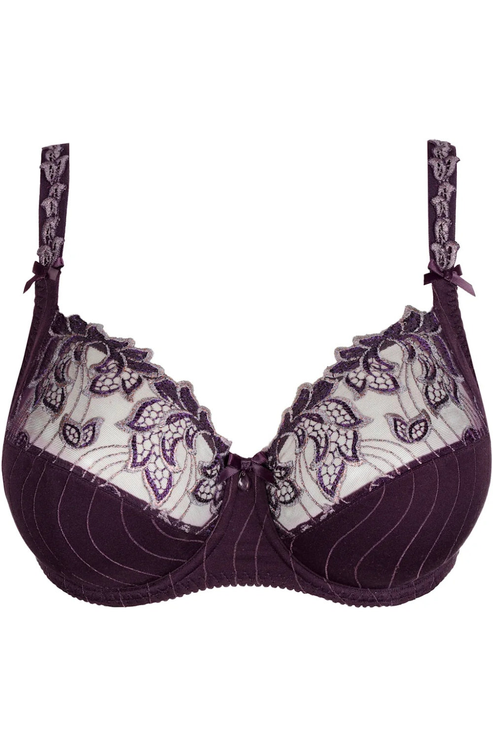 PrimaDonna Deauville full cup bra in Amethyst Gem for cups F to H is delicately embroidered with a floral design and sparkling crystal accents making this bra a number one seller. The three part, deep, full cup has a vertical seam with higher side panels to provide more support and helps to deal with extra breast tissue under your arms ; no underarm bulge! . Microfiber embroidered tulle aids to customize the fit and make it a great option for larger sizes.