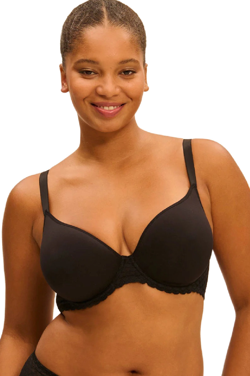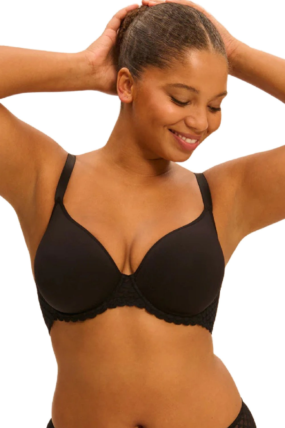 Simone Perele Subtile spacer plunge bra in black is a technical, feminine bra combining sheer knitwear and edgy French lace. The silhouette is sculpted, the curves redesigned. Functional and modern.