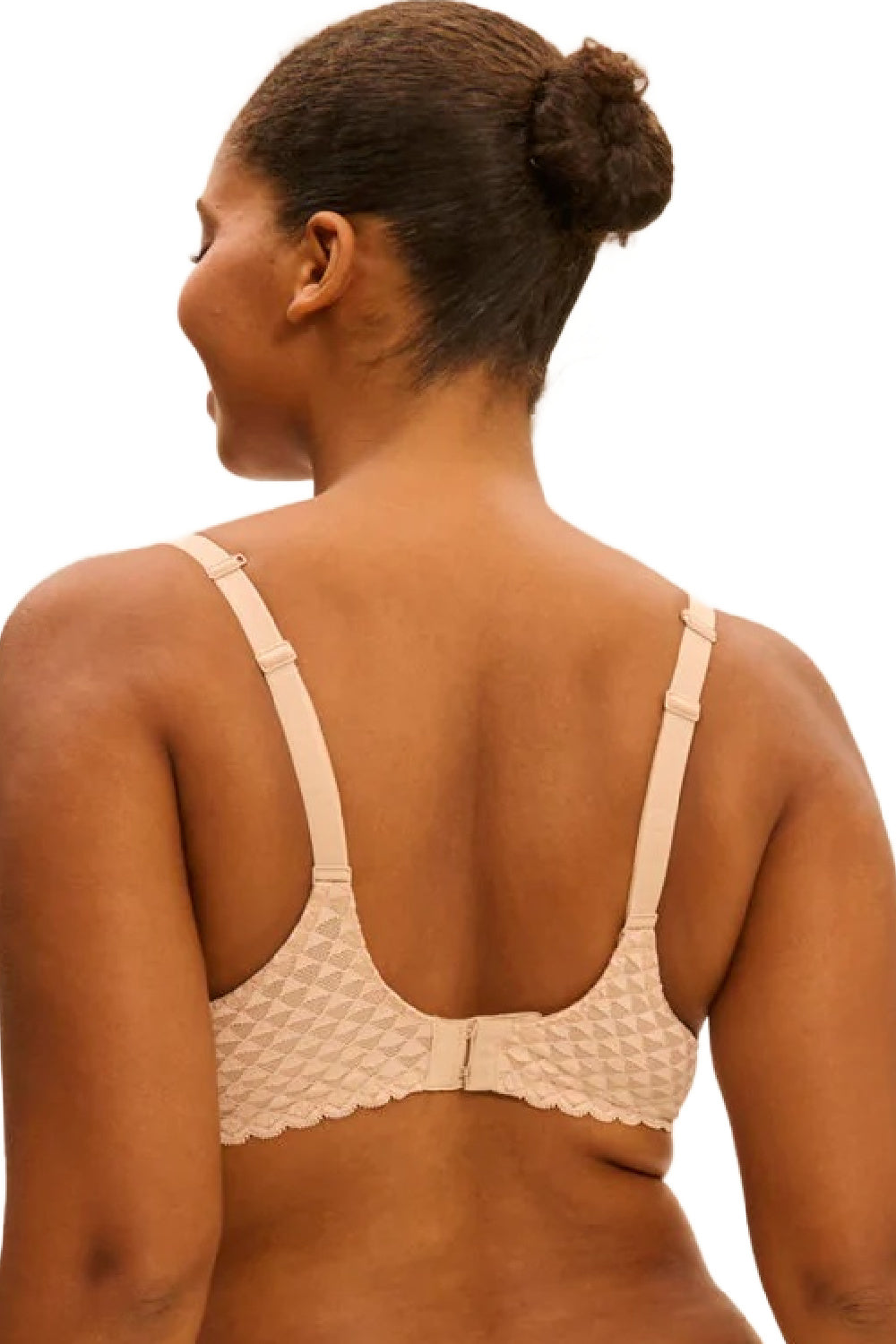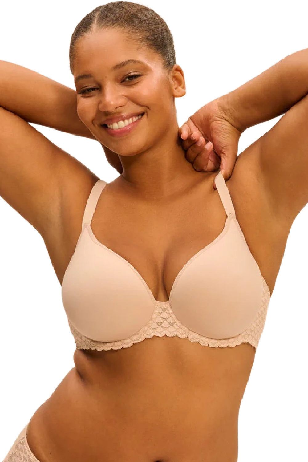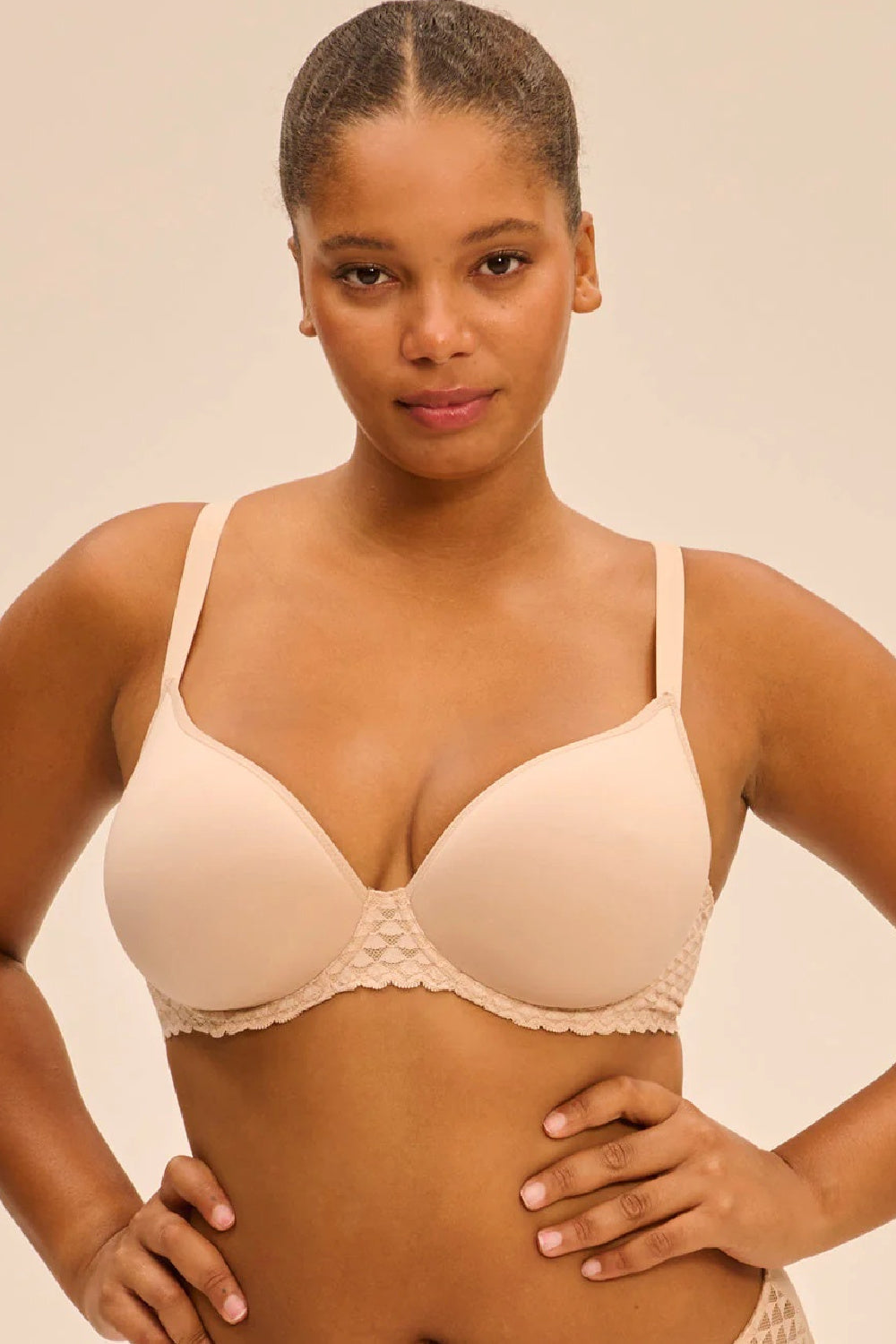 Simone Perele Subtile spacer plunge bra in peau rose is a technical, feminine bra combining sheer knitwear and edgy French lace. The silhouette is sculpted, the curves redesigned. Functional and modern.