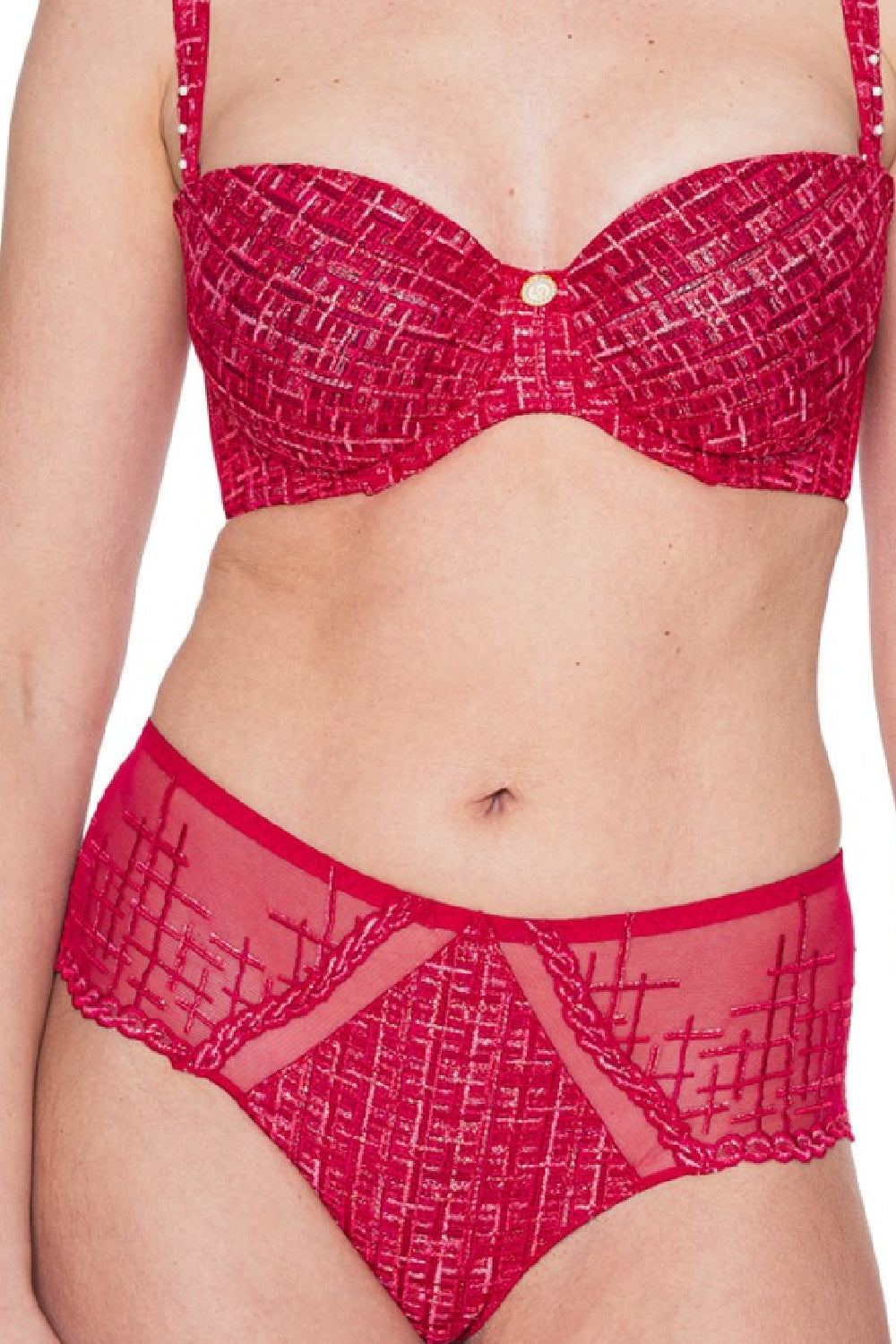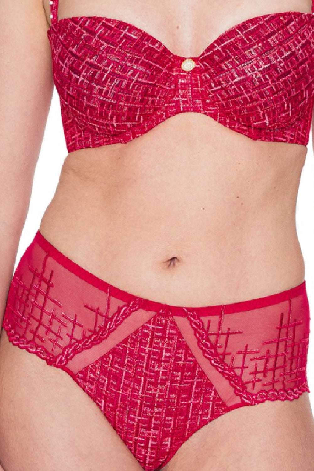 Tweed, reinterpreted in delicate embroidery, seamlessly integrates into the world of lingerie thanks to the unique craftsmanship of the Louisa Bracq tweegy shorty in red. Cuban chain borders add a touch of refinement and modernity to these exceptional creations.