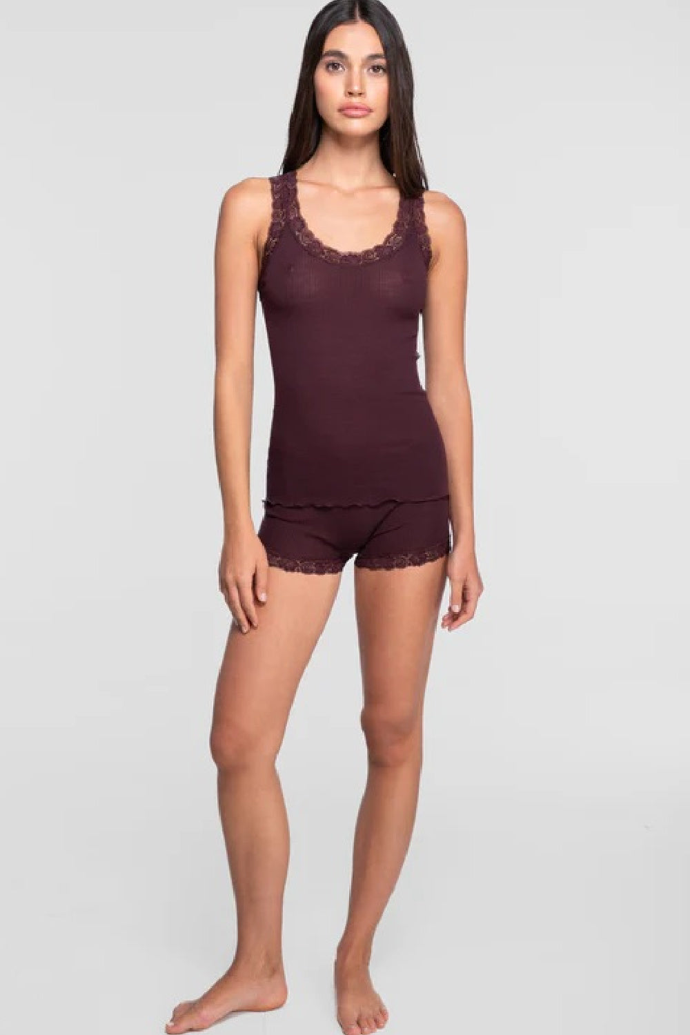 Mid-rise panties from Oscalito in Cherry made of a delicate ribknit fabric blend of Merino extra fine wool and top quality pure silk with the most elegant and feminine French leavers lace, certified and numbered as true “Dentelle de Calais®”.