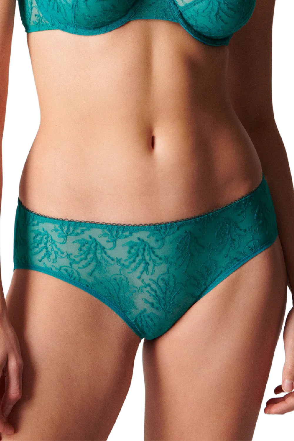 Simone Perele Opaline Shorty in Emerald. This embroidered summer line with its elegant details is inspired by the plant kingdom. Fresh and sophisticated.