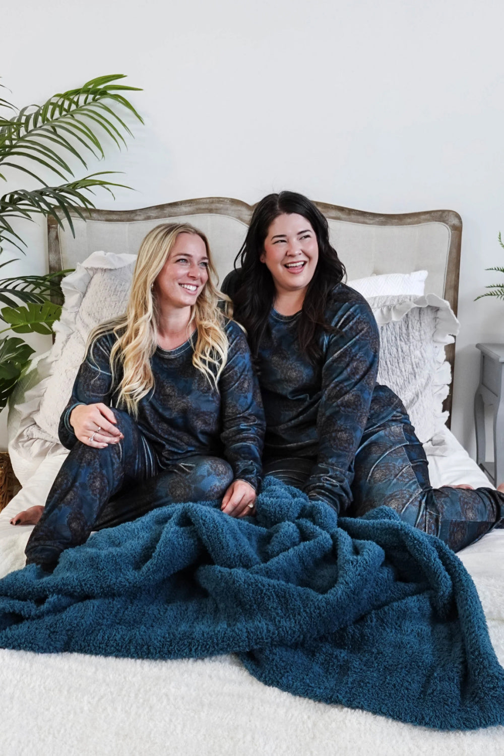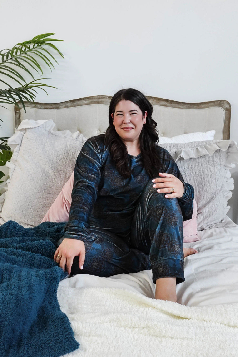 When the chill sets in, wrap yourself in something as glamorous as it is cozy. Cloud Nine Pajamas velvety velour lounge set in Golden Dahlias brings moody florals to life on a deep peacock emerald backdrop, with golden blooms that catch the eye. Equal parts elegant and lounge-worthy, this velour set makes everyday moments feel like luxury.