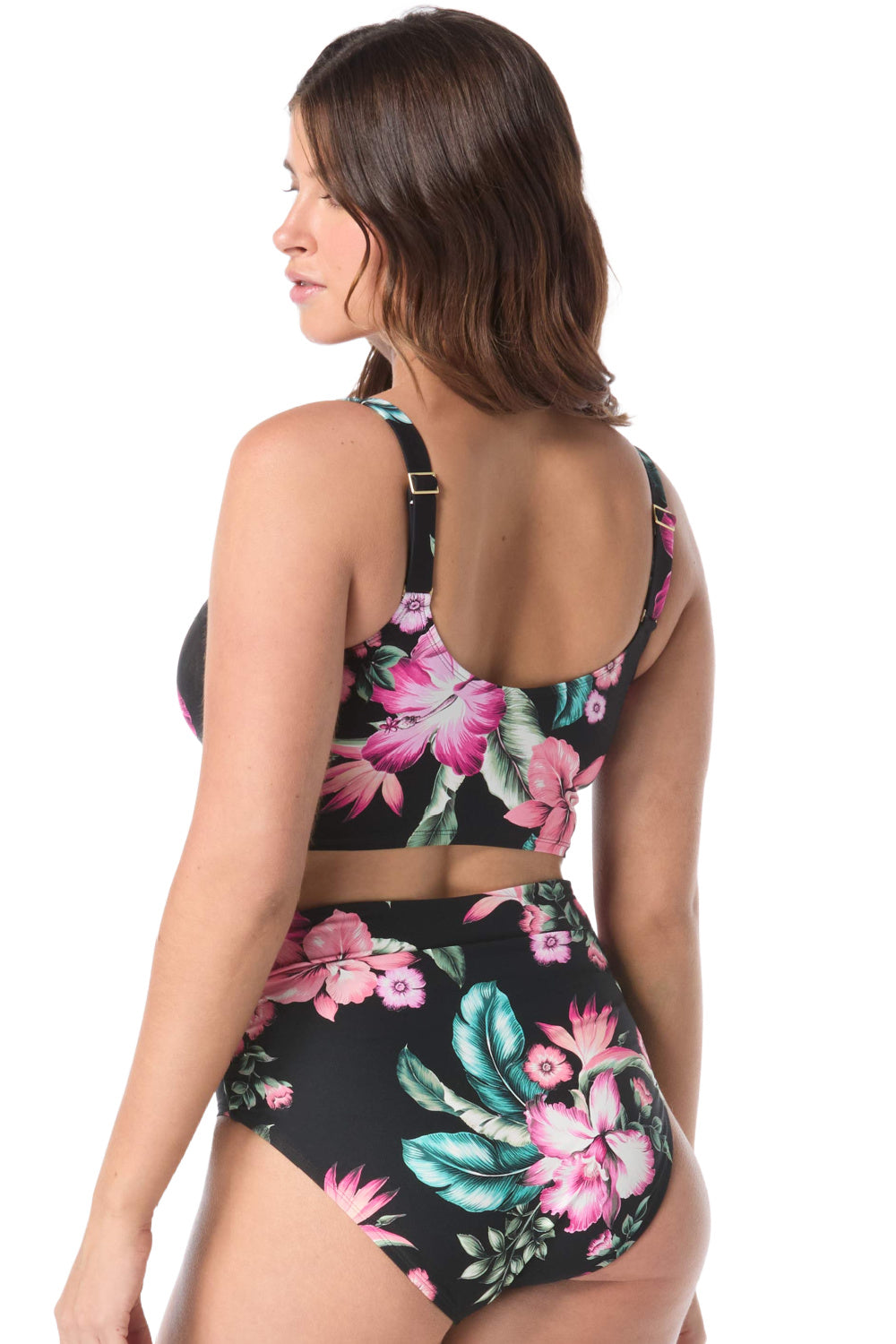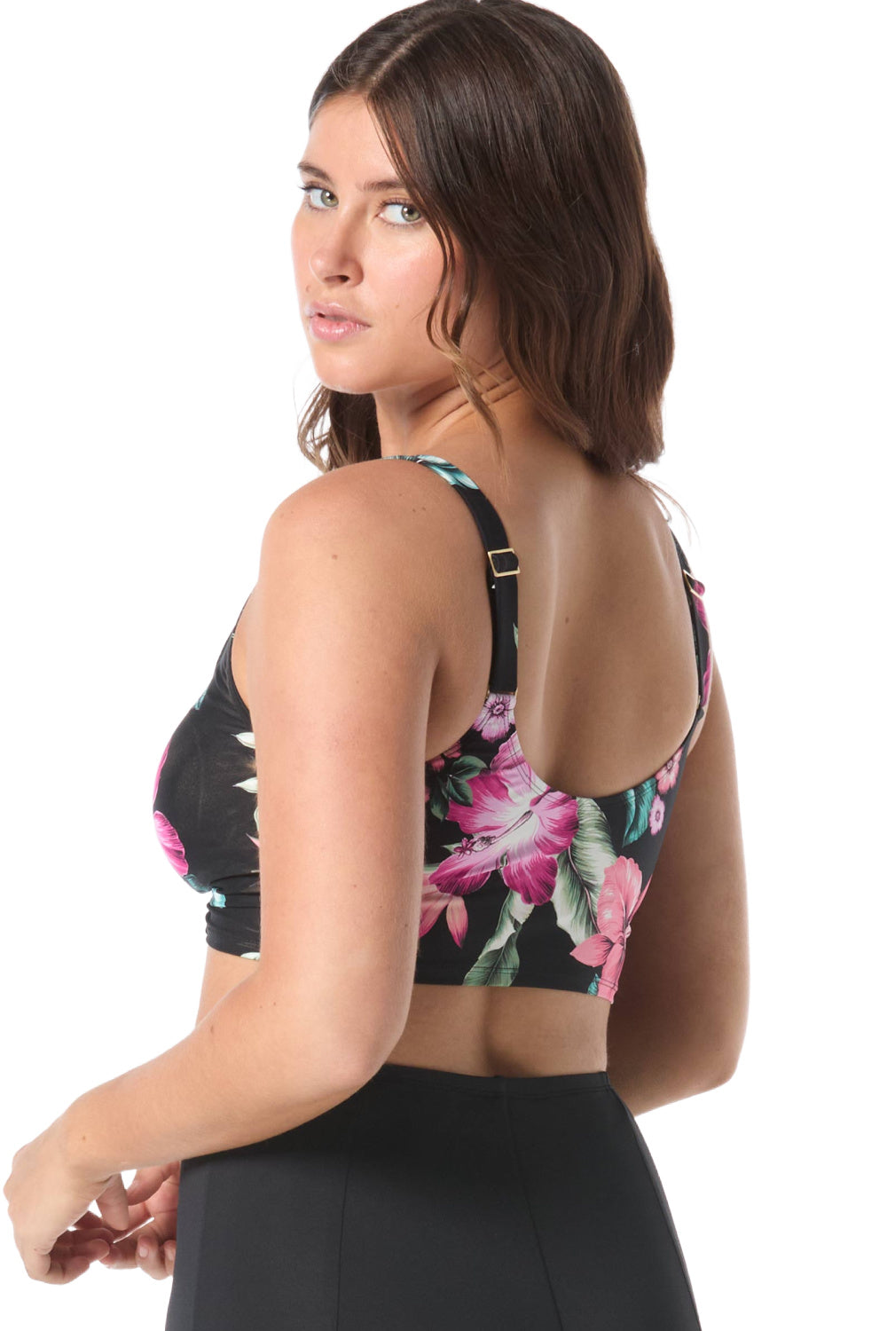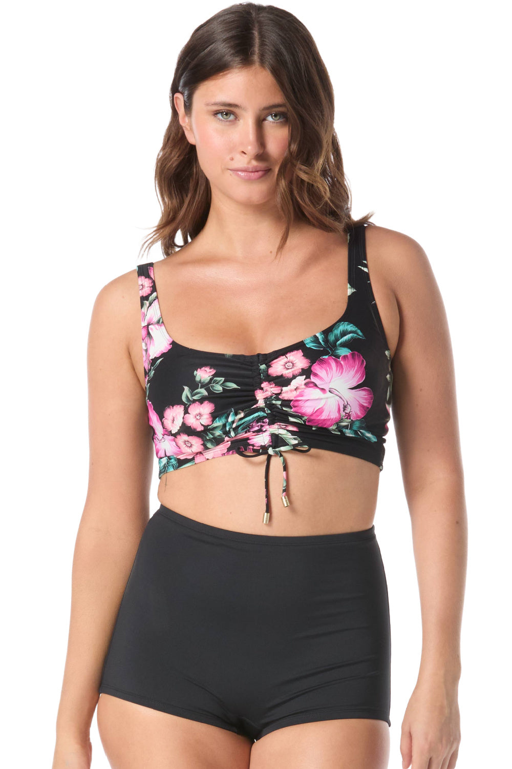 Elevate your swim style in Coco Reef's Spiced Tropical Elevate Bra Sized Shirred Underwire Bikini Top in black multi.