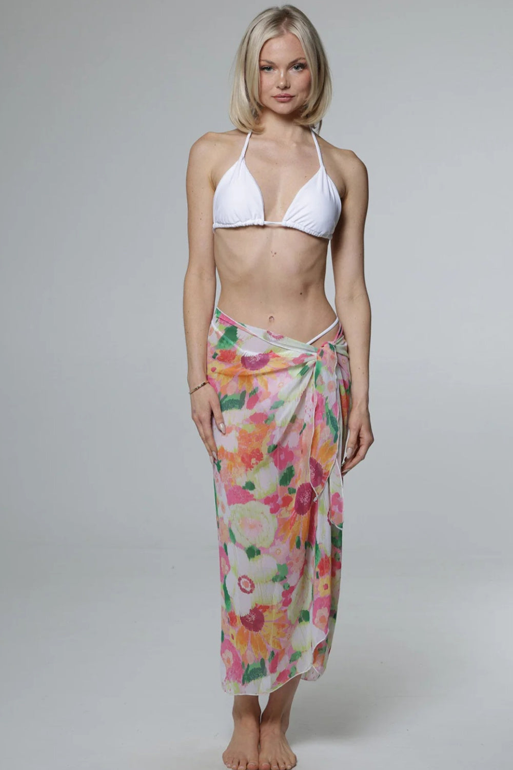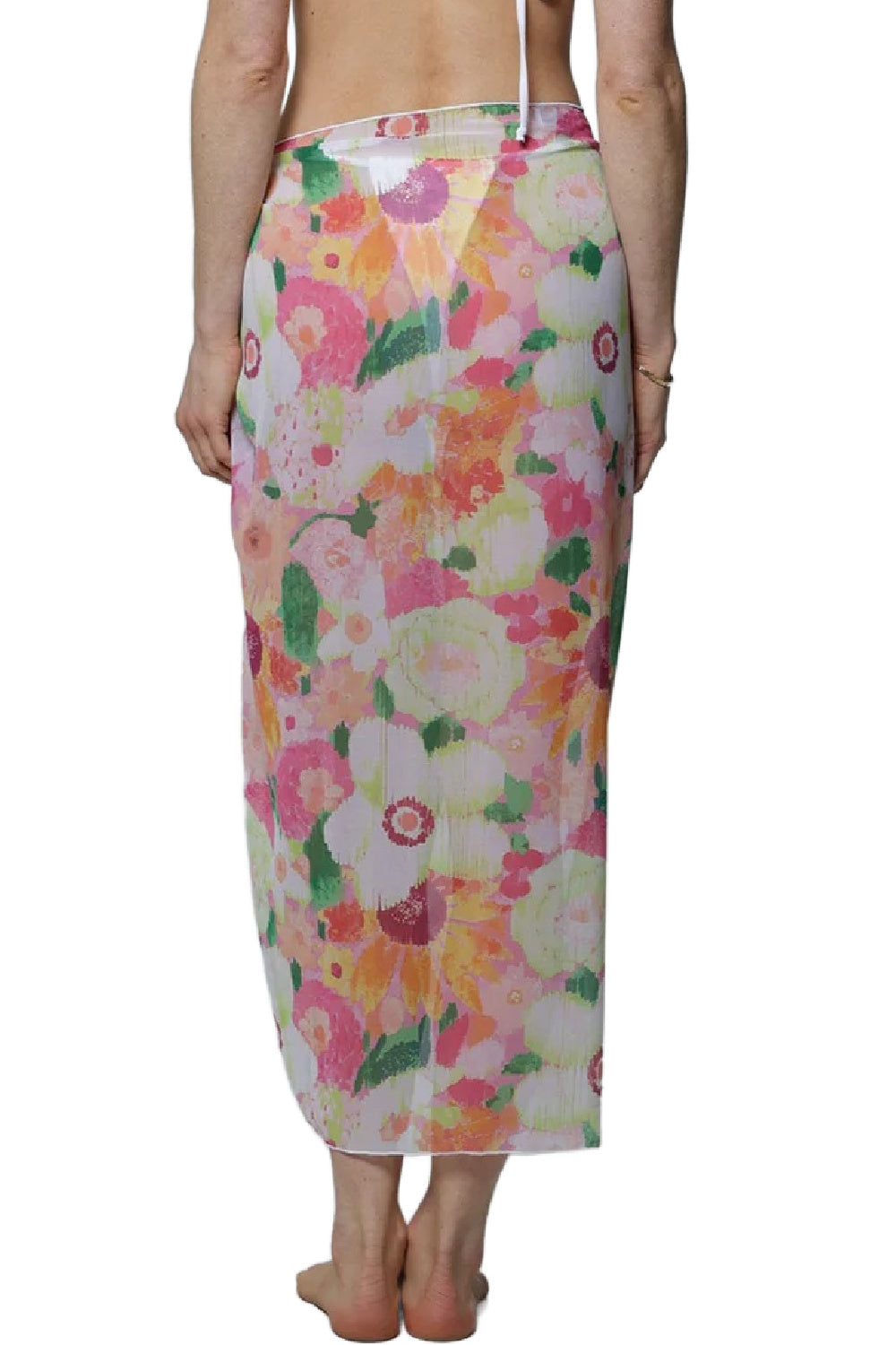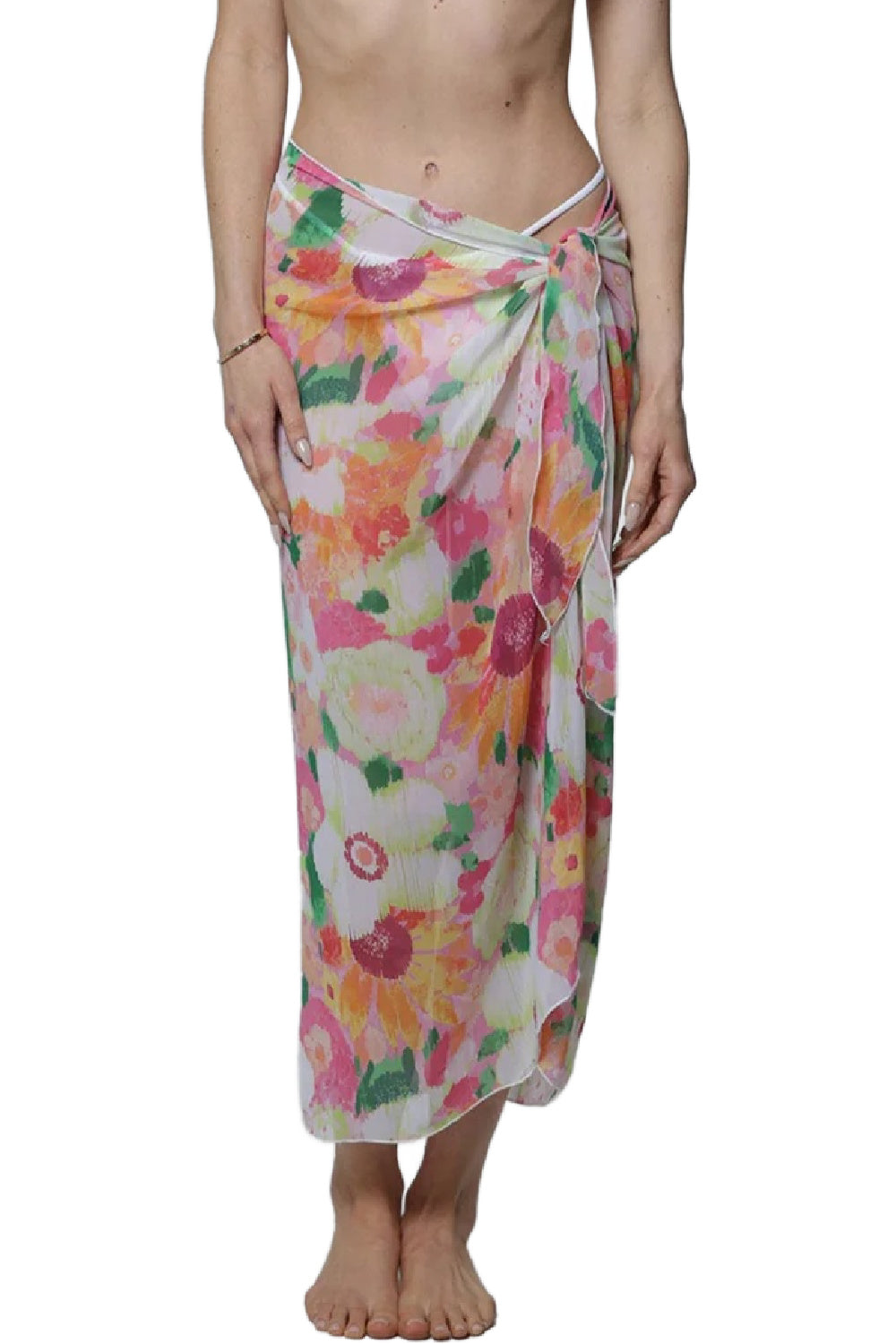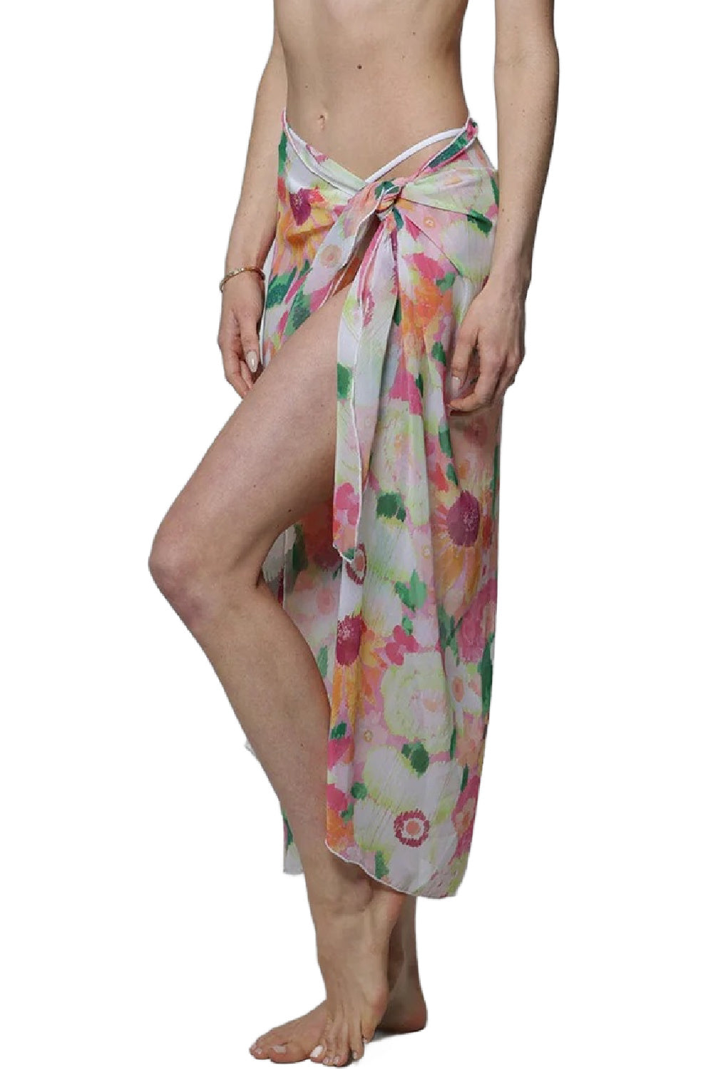 J. Valdi Zinnia long sarong is in chiffon which is soft, sheer, and breathable. It's important to note that this fabric has no stretch or give, so if you are unsure about sizing, J. Valdi recommends sizing up!