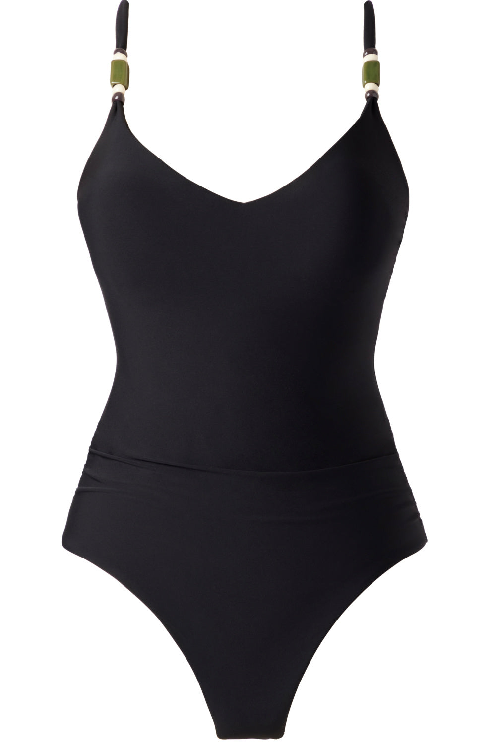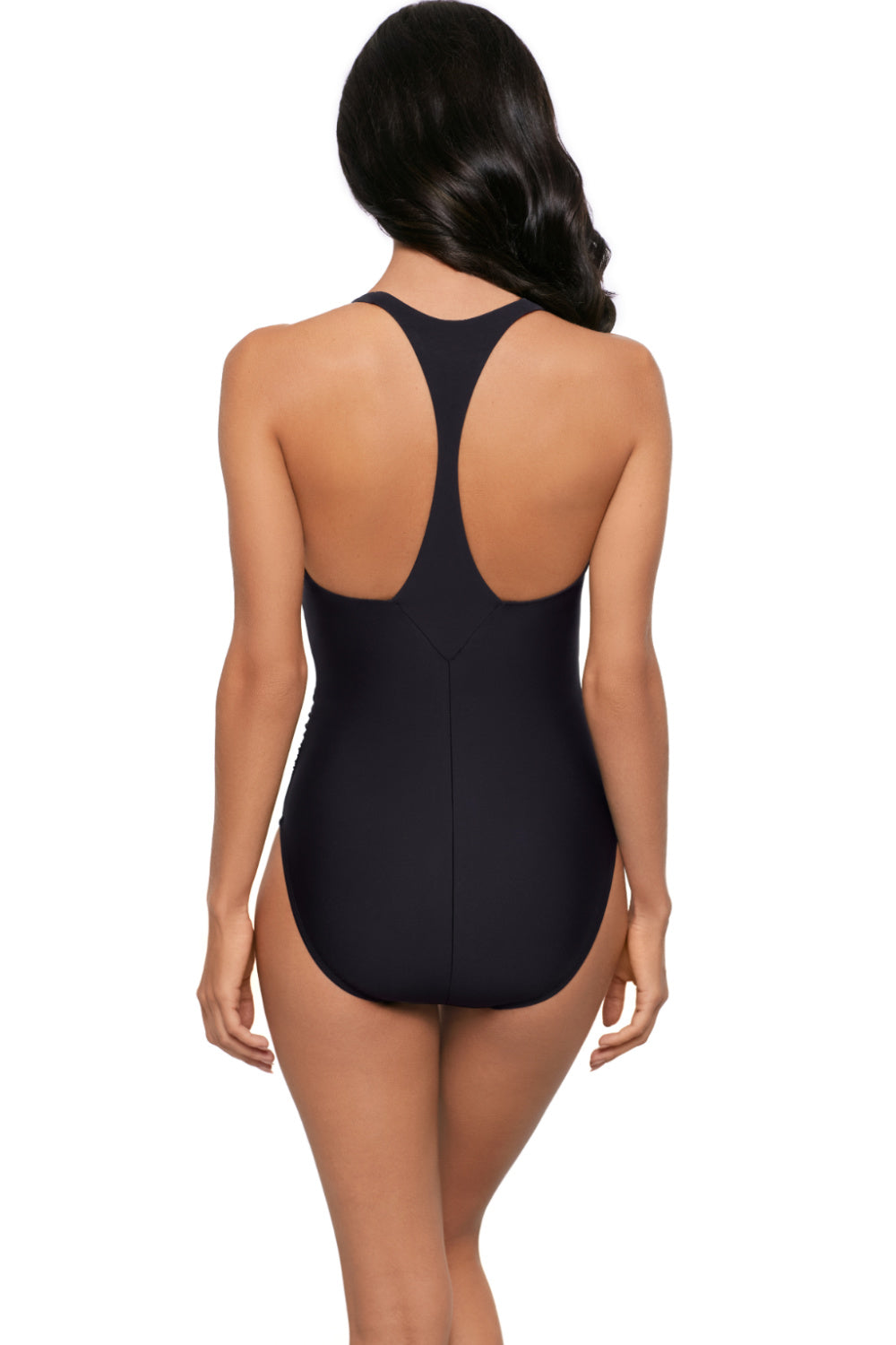 This tummy concealing Magicsuit Milli swimsuit in black is framed by sleek straps accented with glossy resin bead stacks. Gentle shirring flatters allover, while a racerback design and soft cups support your bust.