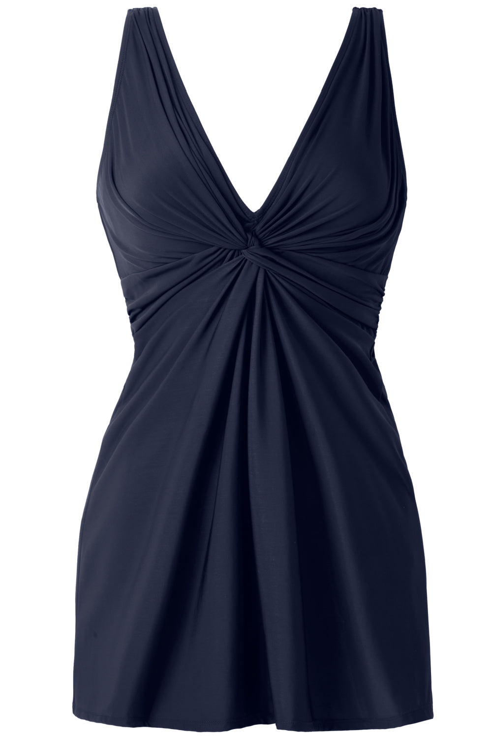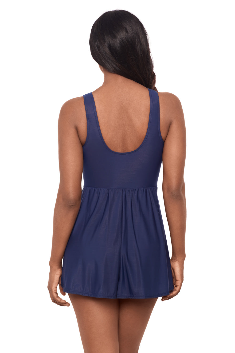 This Miraclesuit Must Haves Marais Swimdress in Midnight will capture every eye as its twisted knot center at the bust casually enhances while a deep v-neckline embraces all things glamorous. The loose-fitting overlay minimizes the waist, controls the tummy and slenderizes your shape. Thicker set straps and a mid-scoop back work wonders for all day solid support. Made with LYCRA® XTRA LIFE™ Spandex for a long lasting fit.