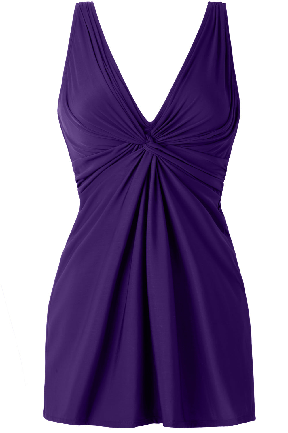 This Miraclesuit Must Haves Marais Swimdress in Mulberry will capture every eye as its twisted knot center at the bust casually enhances while a deep v-neckline embraces all things glamorous. The loose-fitting overlay minimizes the waist, controls the tummy and slenderizes your shape. Thicker set straps and a mid-scoop back work wonders for all day solid support. Made with LYCRA® XTRA LIFE™ Spandex for a long lasting fit.
