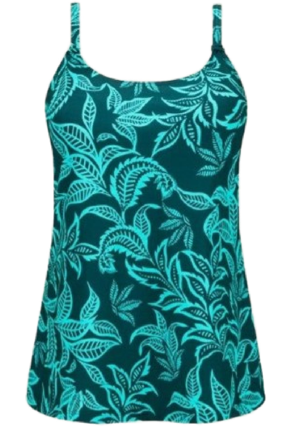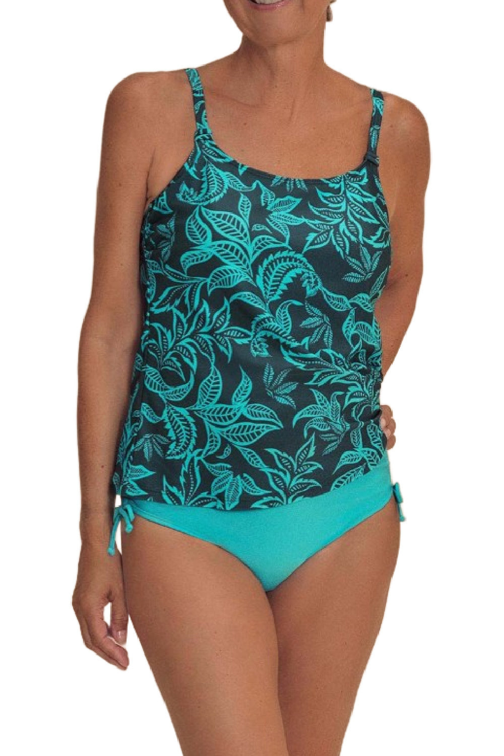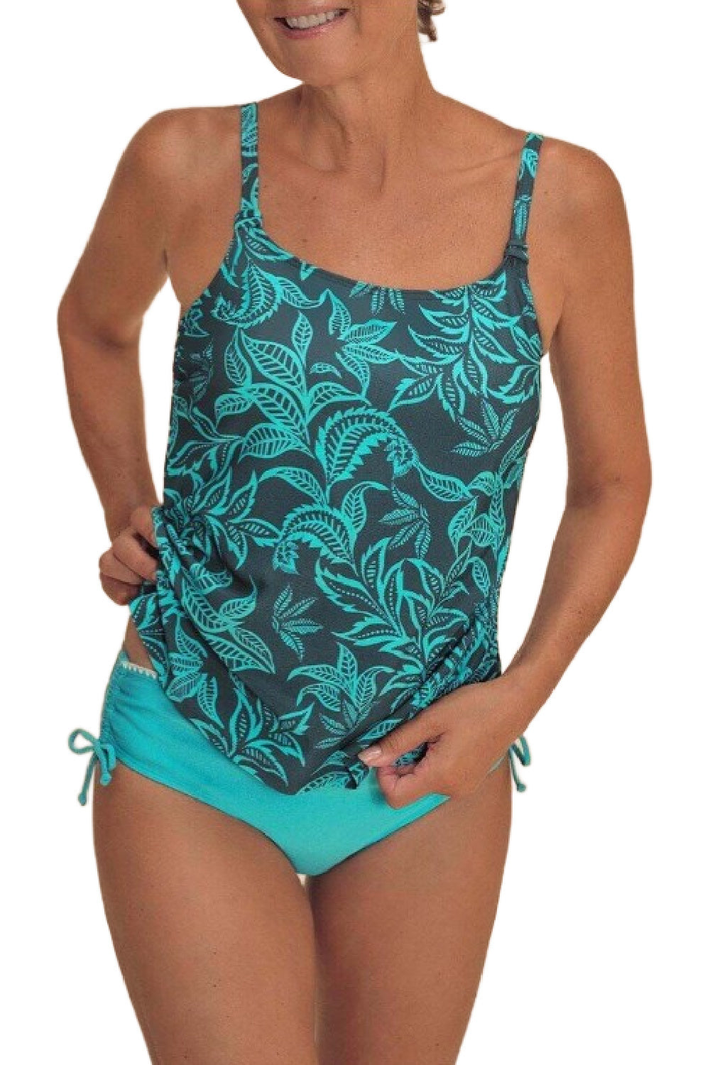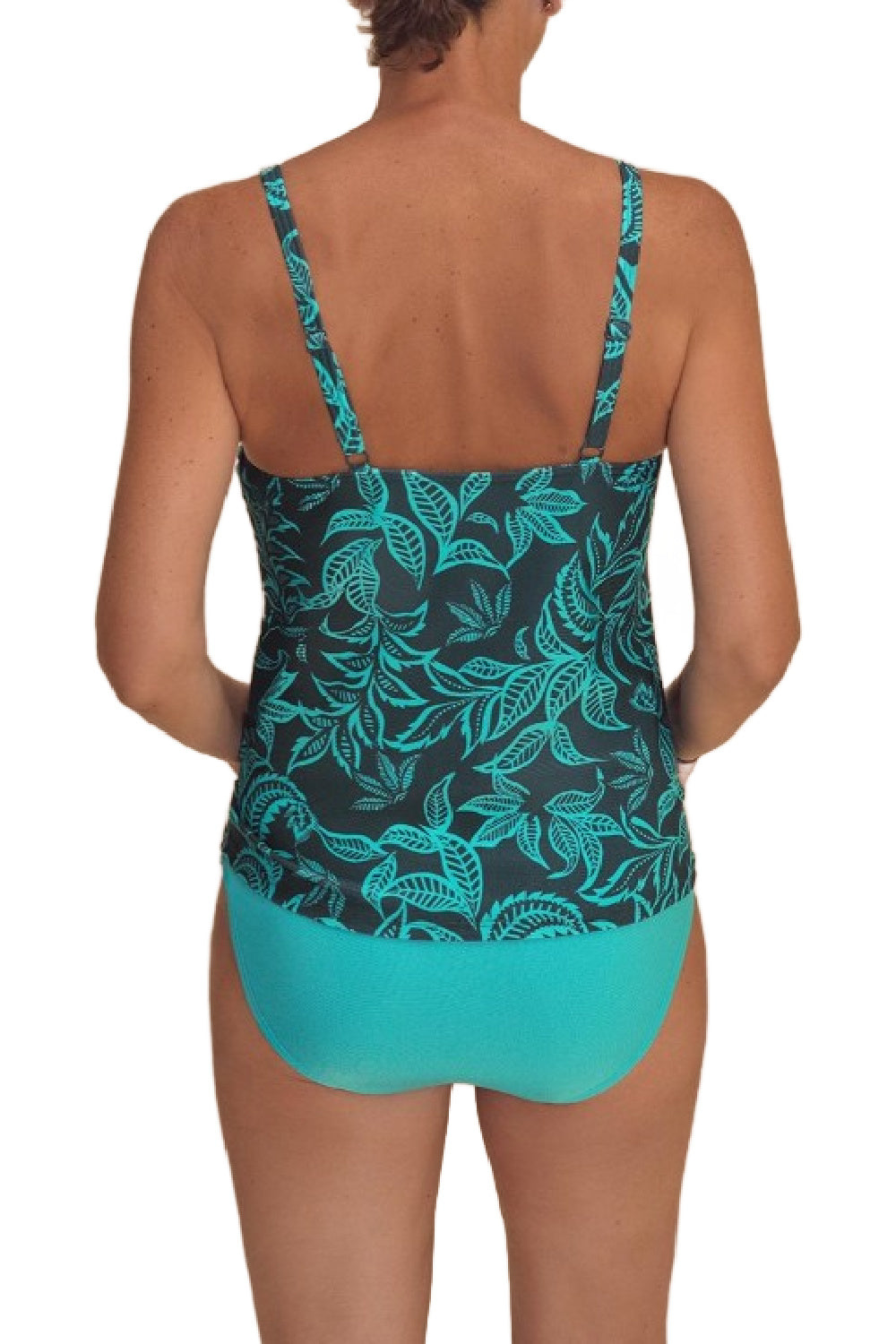 Amoena Salerno mastectomy tankini in deep emerald/light jade combines style and functionality with thoughtful design elements that cater to comfort and confidence. This swimwear piece is crafted to provide excellent support for full and partial prostheses while featuring a fresh tropical print and UV protection.