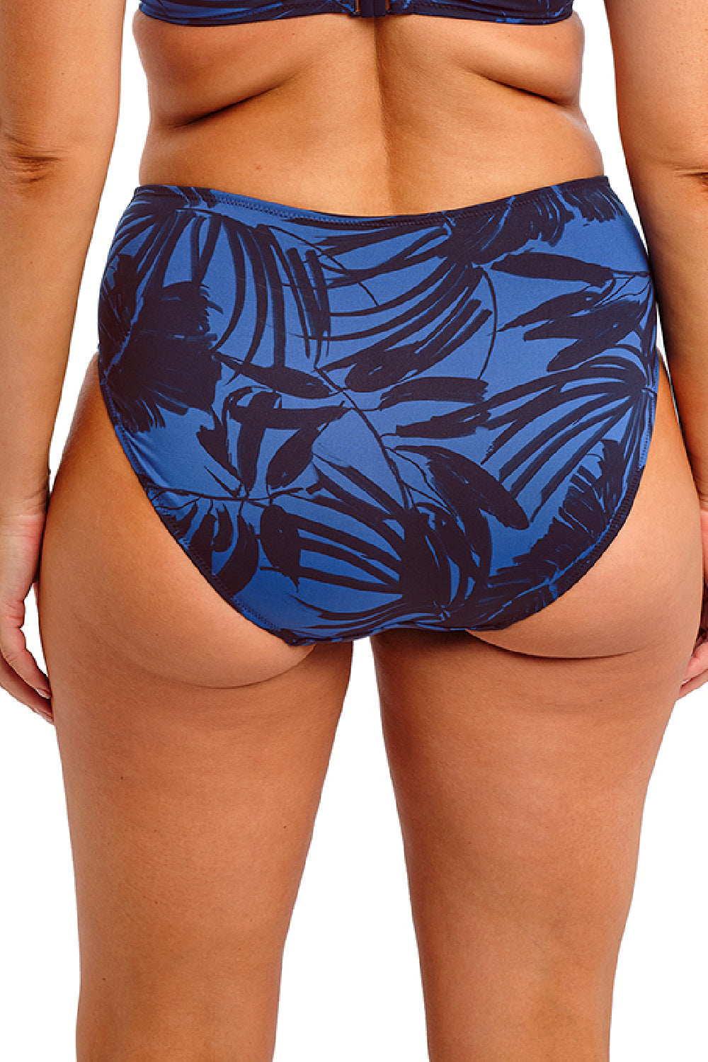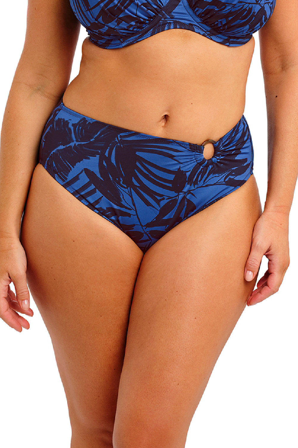 Elevate your swimwear look with Fantasie Malabar Coast High Waist Bikini Brief in Midnight. Showcasing a timeless palm print in beautiful royal blue and navy tones for a irresistible oceanic feel. Offering a fuller coverage fit and a higher cut leg, adorned with a tortoiseshell effect ring detail at the front for an elevated finish.