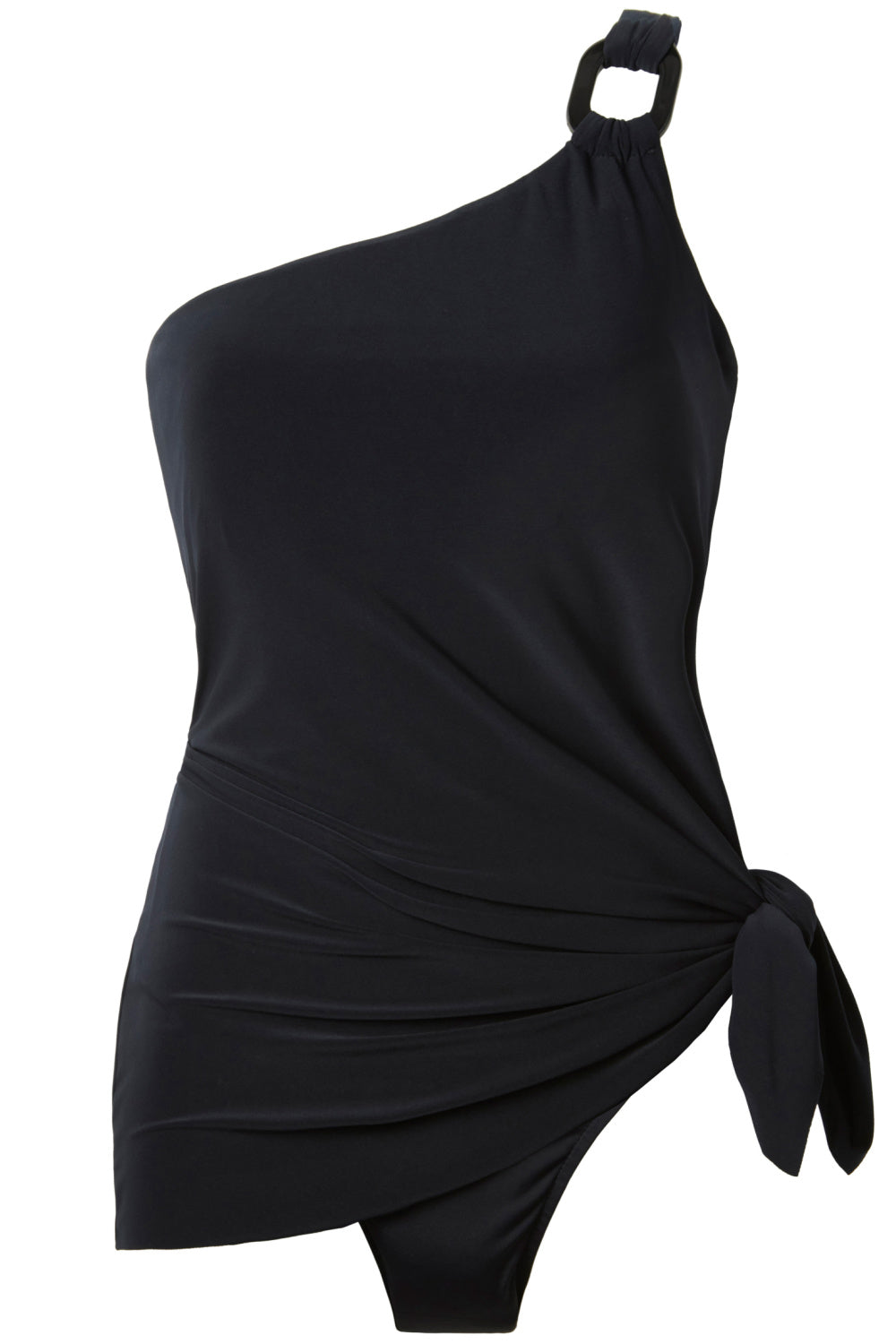 Chic style is imminent in the Magicsuit Solid Amal Swimsuit in Black as this luxurious one-piece wonder works a charming effect as built-in control fabric smoothes and shapes your figure. The flattering draped front can be tied at the side or worn long to accentuate or hide your curves. The fixed, one-shoulder strap comfortably stretches and features a stylish square embellishment. Made with LYCRA XTRA LIFE‚ Spandex for a long-lasting fit.