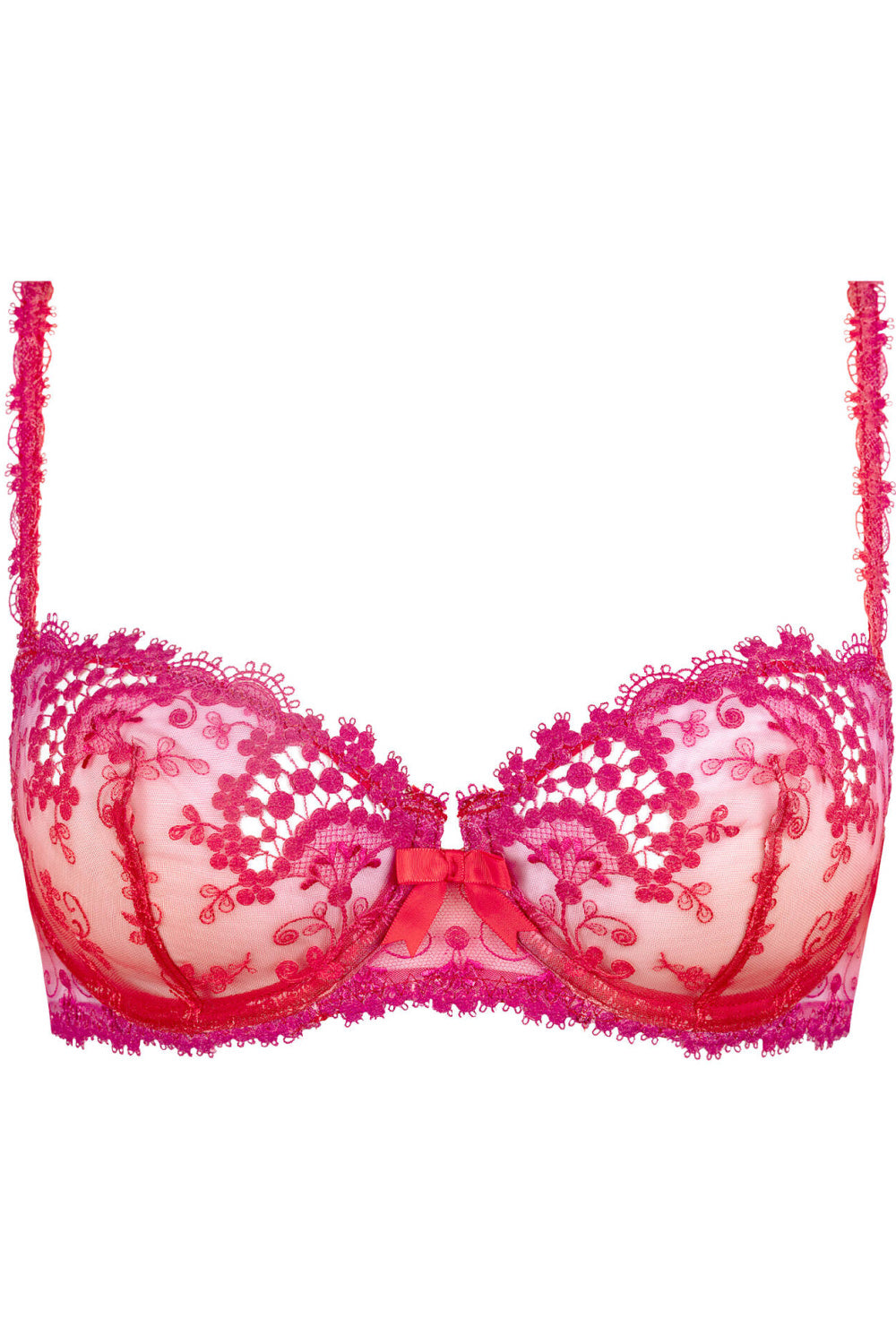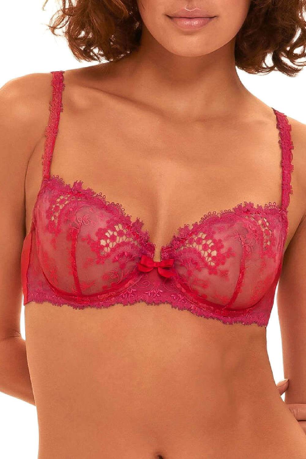 Simone Perele Wish sheer demi bra in rainbow red has sheer tulle cups decorated with a striking embroidery and against-the-skin scalloped edging for an effect that’s absolutely gorgeous on the body. No detail is left untouched: Italian satin Jacquard, embroidery on the band and straps, and a satin bow.