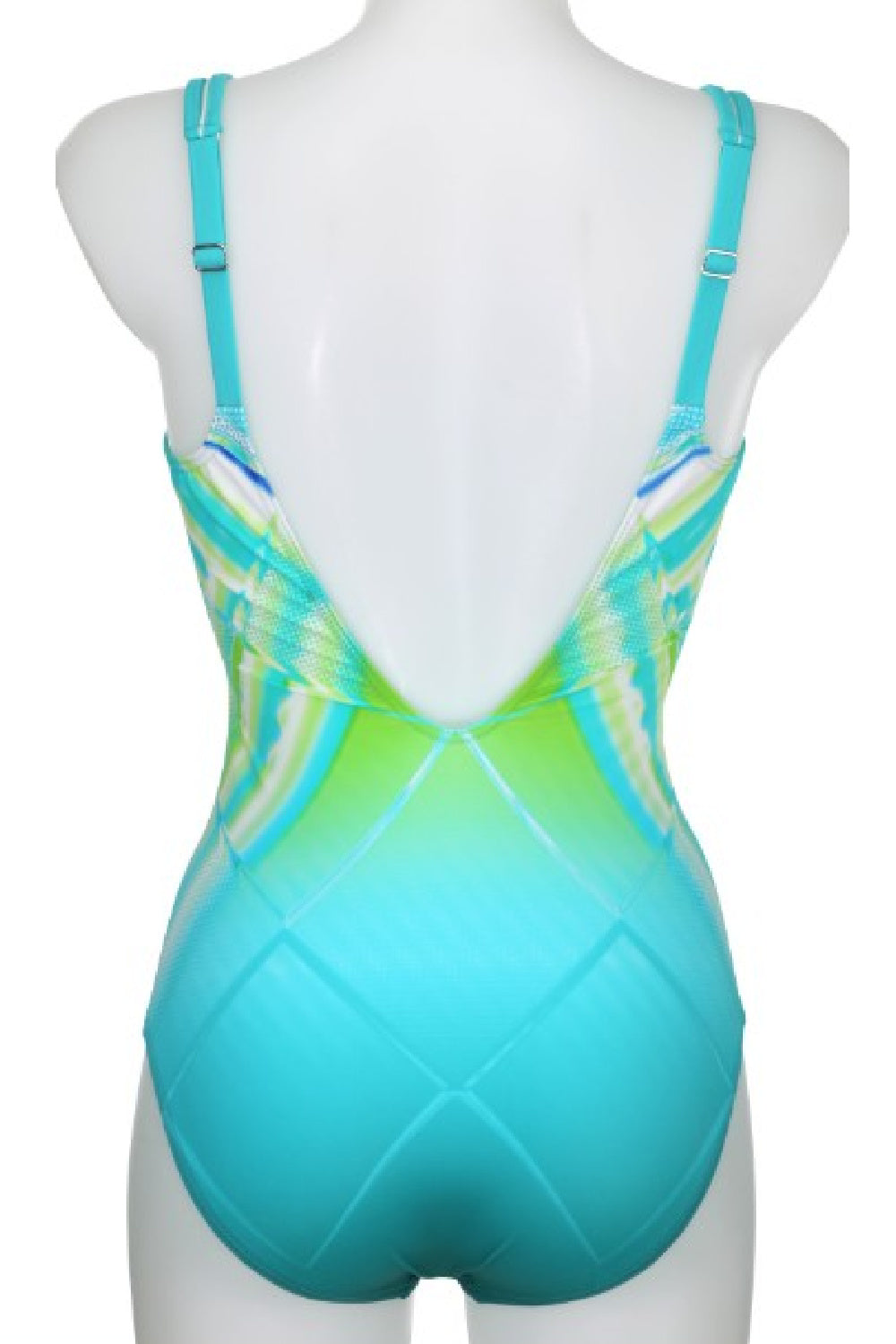 SUNFLAIR® V-neck swimsuit with integrated soft cups in Turquoise is a very modern, urban swimsuit with a V-neckline and deep U back.
