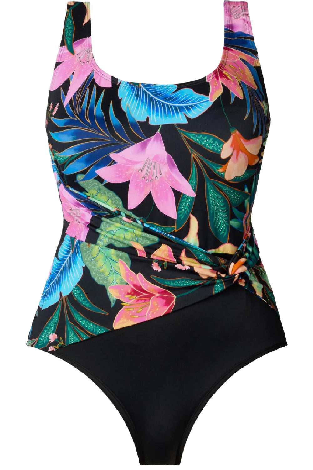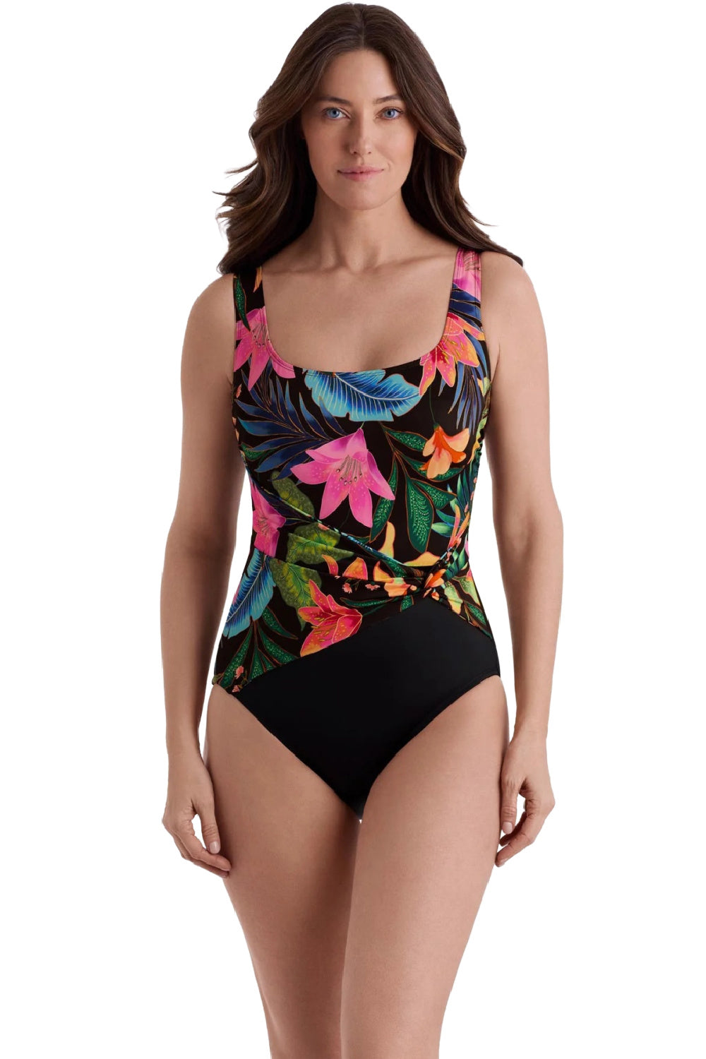 Longitude Long Torso Midnight Plumeria Scoopback Twist Sash Tank Swimsuit in This sleek silhouette features a flattering twist front that hugs your shape in all the right ways. Built-in tummy control gives all-day comfort and confidence.
