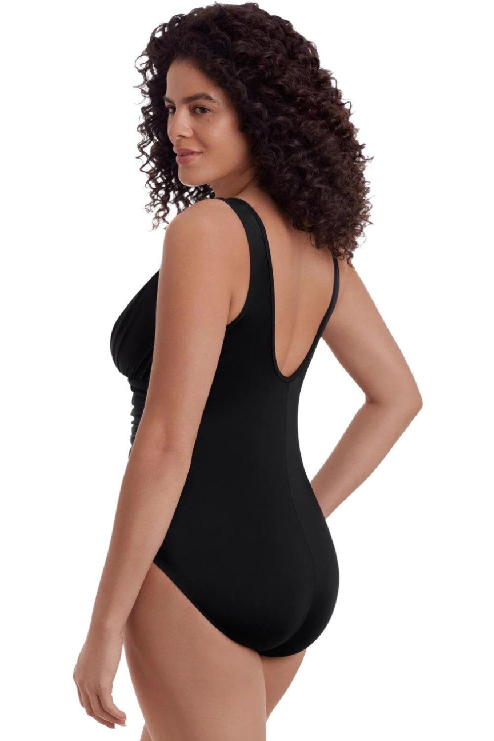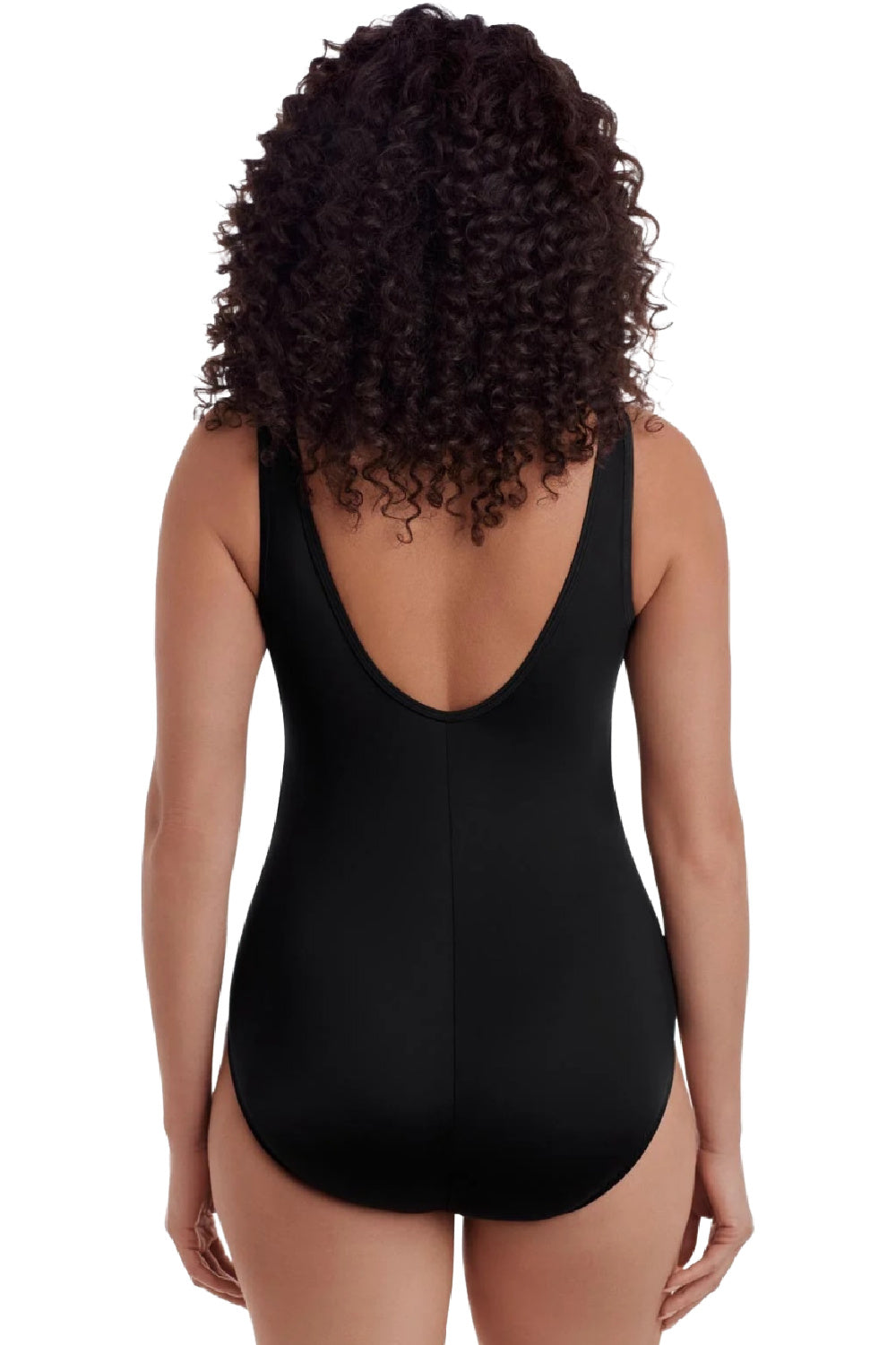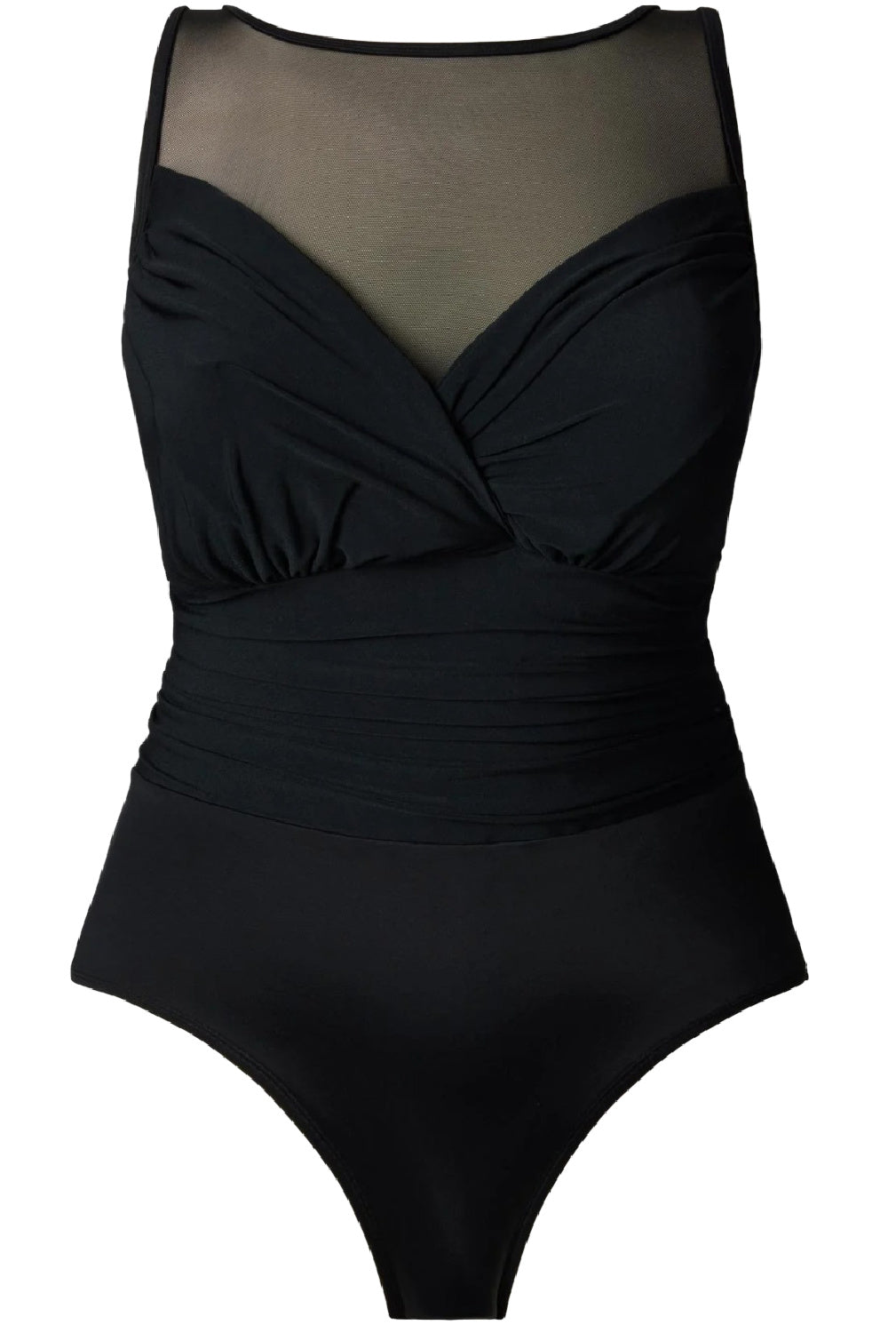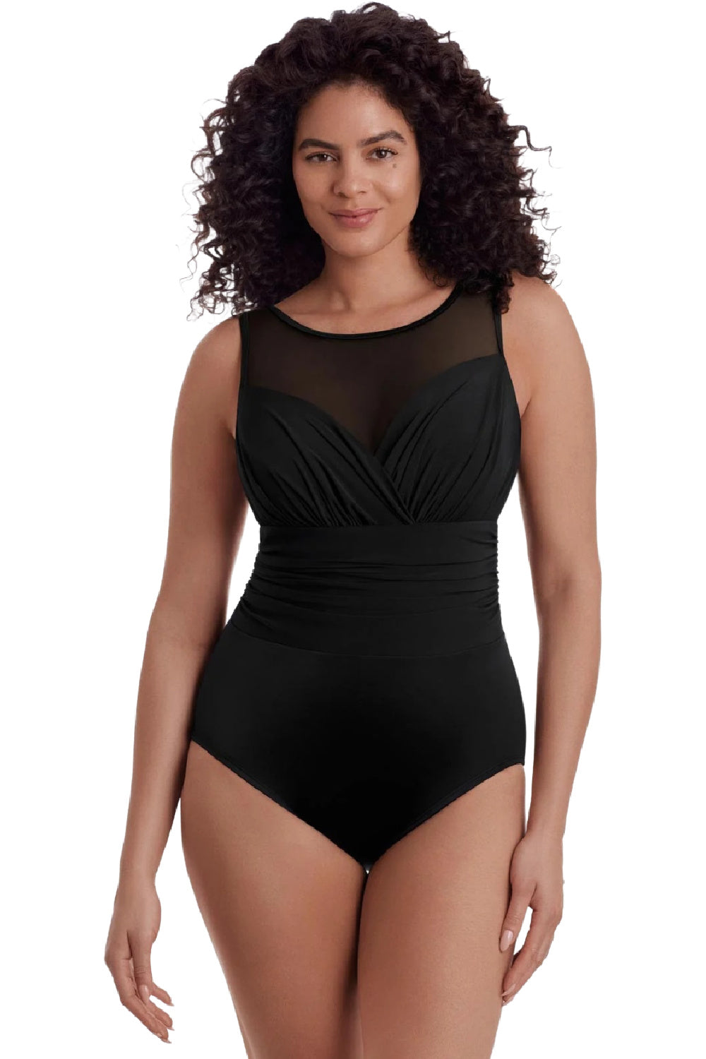 Longitude Solidtude Long Torso Solidtude Mesh High Neck Scoopback swimsuit in black offers all day comfort. A longer length and finer fit enhance all figures, embracing confidence within.