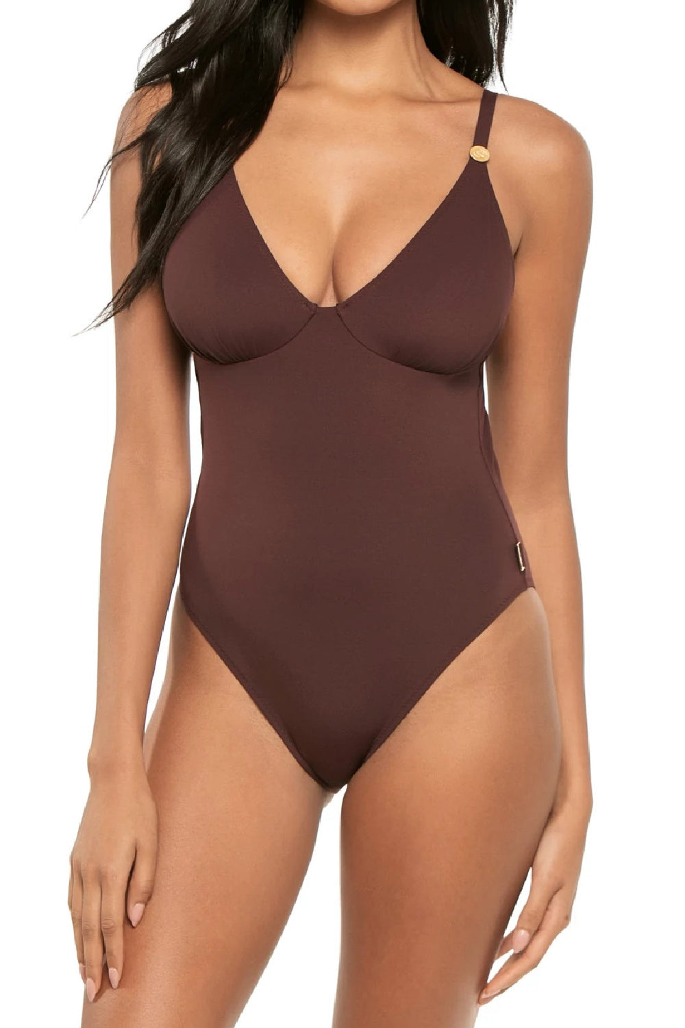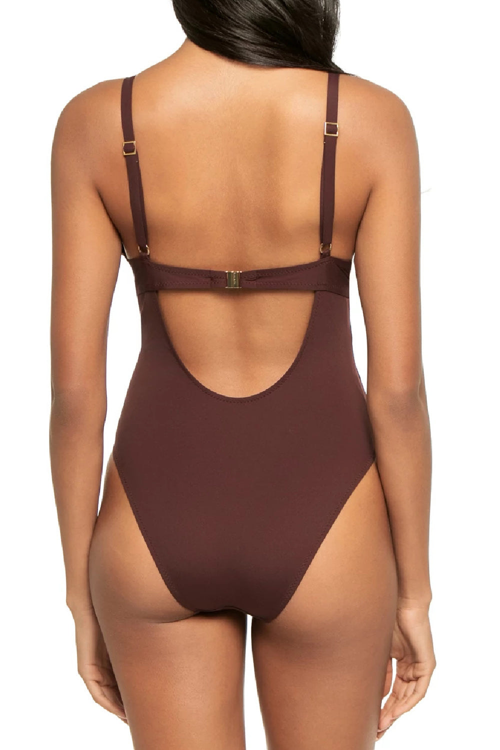 This Shan Magnolia one-piece bralette swimsuit in burgundy, decorated with SHAN jewel, features elegant ruching at the bust and thin, adjustable straps for a refined and flattering fit.