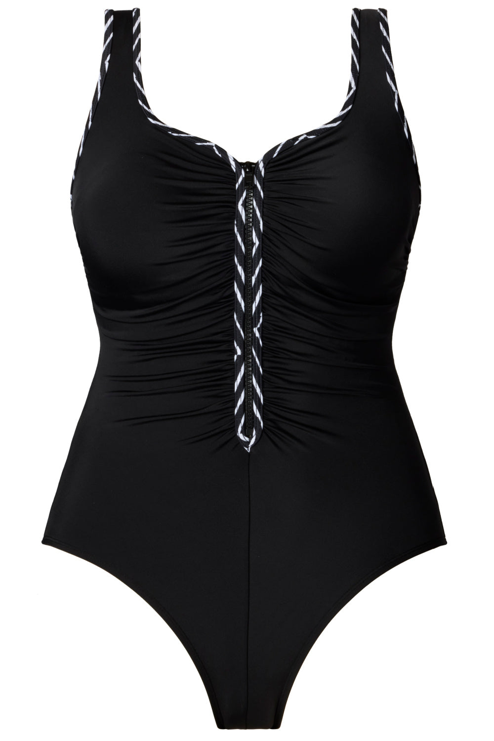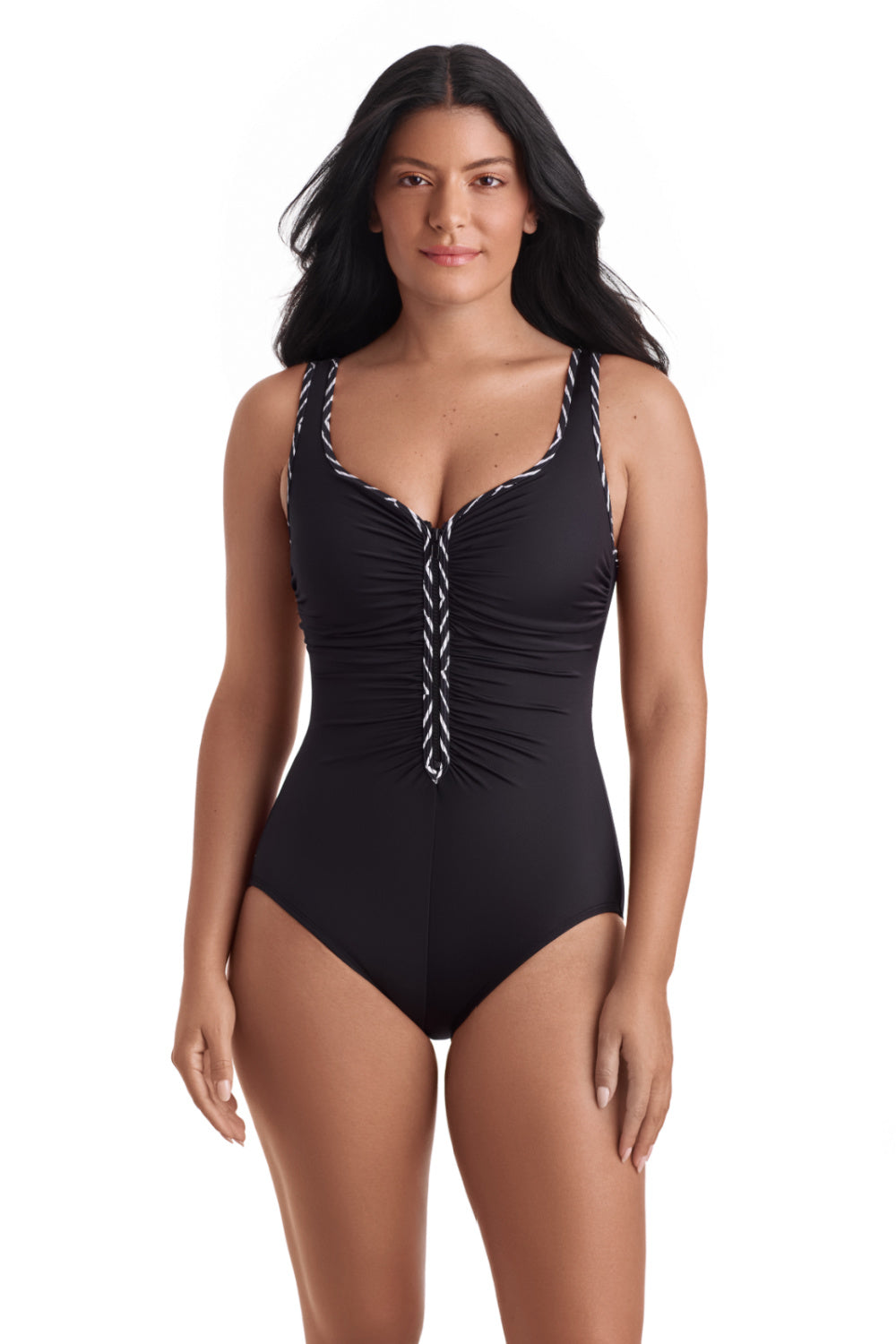 Shape Solver Sport In Graphic Detail shirred zipper swimsuit is a performance-minded tank-style one piece with subtle front shirring that adds shape without bulk. The locking zipper makes gearing up effortless, and the sculpting powernet panel supports your core through movement. Featured in Graphic Detail, a bold black-and-white maze motif.