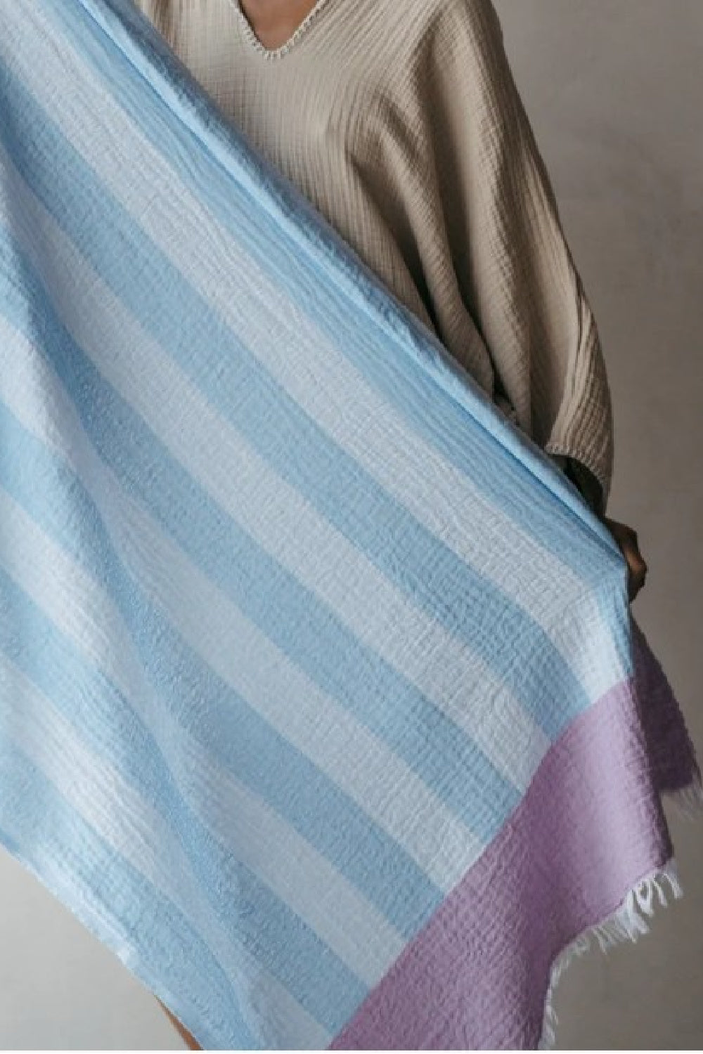 With summer hues and a classic awning striped design, the Pokoloko Boardwalk Towel in blue lilac will have you thinking of fun days at the beach, sunsets on the lake and BBQ’s with friends..