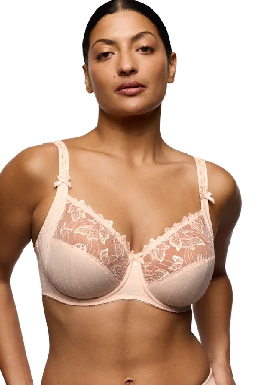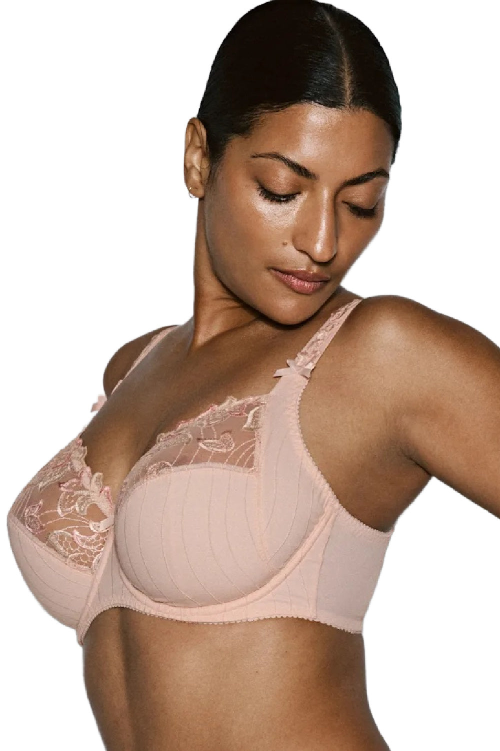 PrimaDonna Deauville full cup bra in Venus for cups F to H is delicately embroidered with a floral design and sparkling crystal accents making this bra a number one seller. The three part, deep, full cup has a vertical seam with higher side panels to provide more support and helps to deal with extra breast tissue under your arms ; no underarm bulge! . Microfiber embroidered tulle aids to customize the fit and make it a great option for larger sizes.