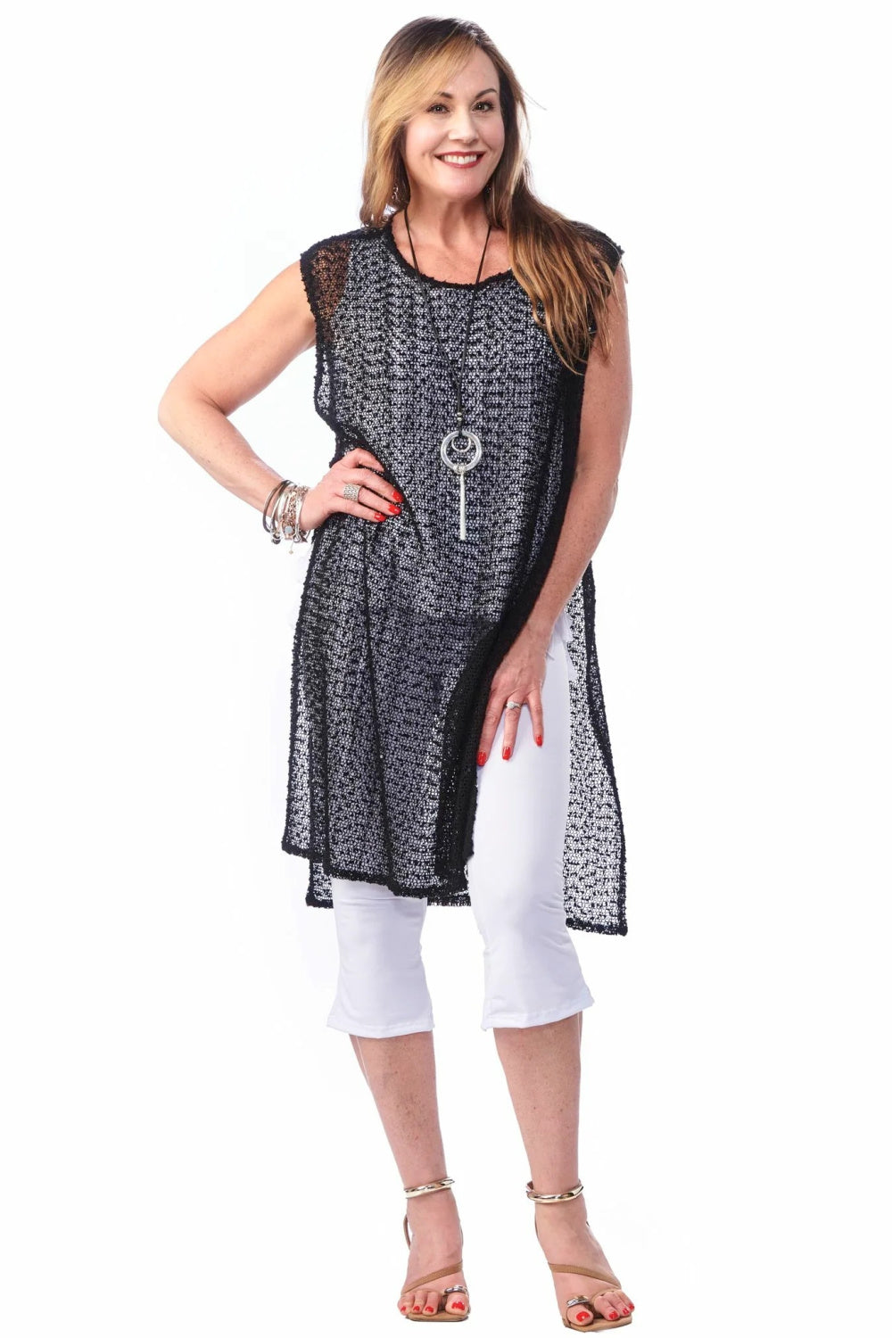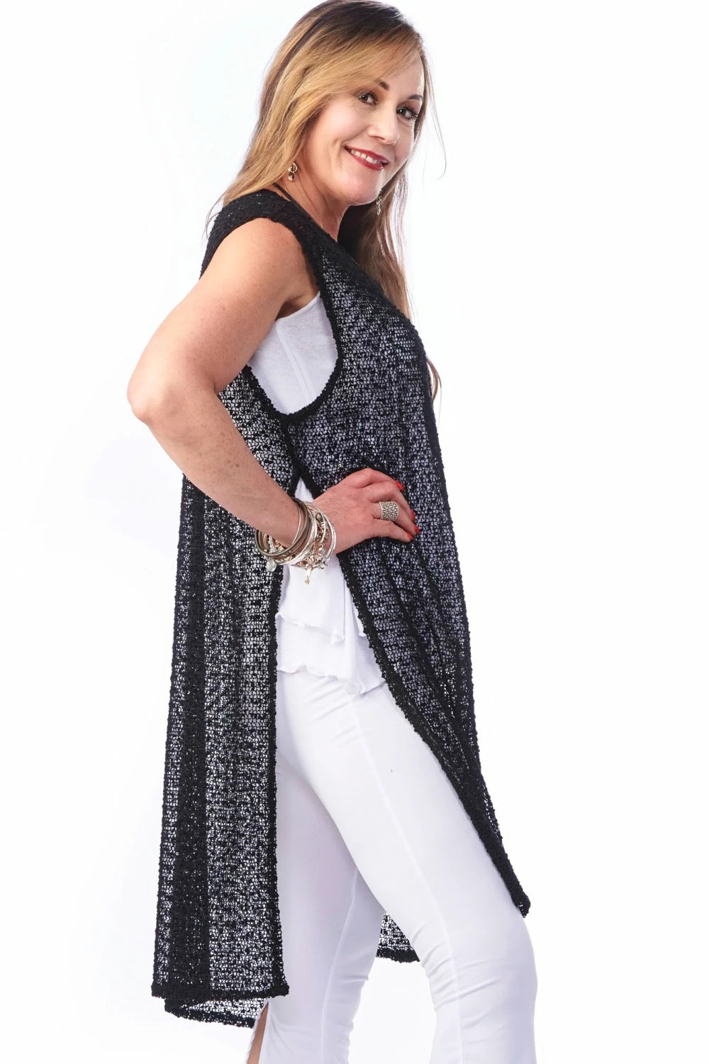 Introducing the Rapz Mesh High Slit Mesh Coverup in sparkle black, a quintessential piece for the Boho Chic enthusiast. Designed from 100% polyester for a lightweight and airy feel, this coverup is perfect for layering over your favorite swimwear or pairing with a casual ensemble. Featuring high slits that add a touch of allure and freedom of movement, this Canadian-made garment is as versatile as it is stylish. Whether you're lounging by the pool or exploring a seaside market, this coverup brings an effortless elegance to any look.