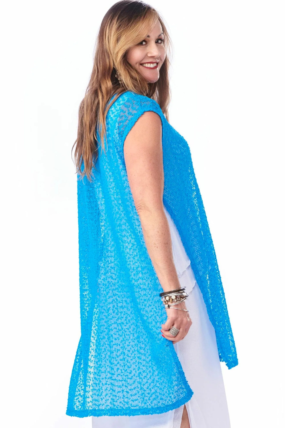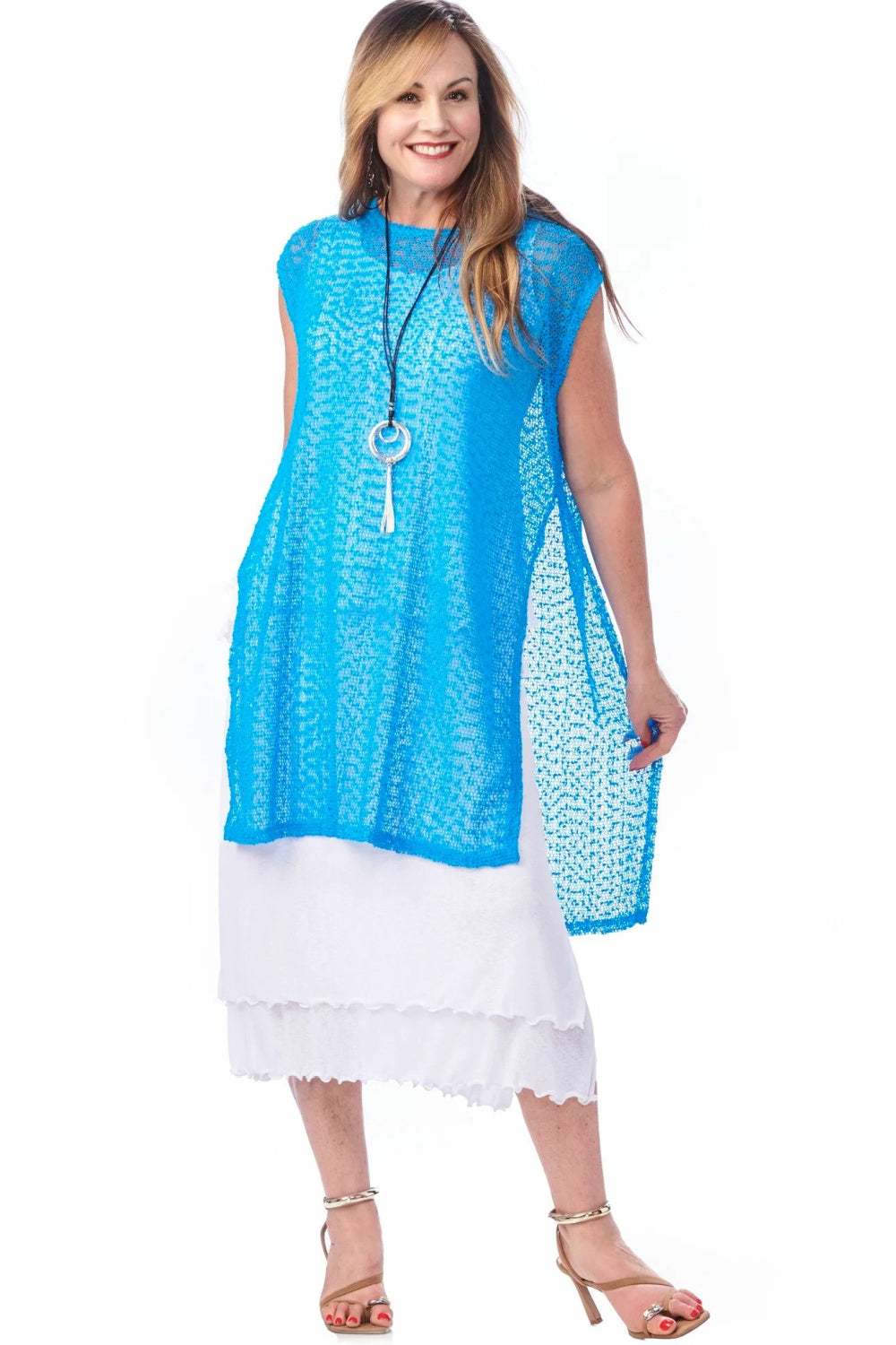 Introducing the Rapz Mesh High Slit Mesh Coverup in sparkle turquoise, a quintessential piece for the Boho Chic enthusiast. Designed from 100% polyester for a lightweight and airy feel, this coverup is perfect for layering over your favorite swimwear or pairing with a casual ensemble. Featuring high slits that add a touch of allure and freedom of movement, this Canadian-made garment is as versatile as it is stylish. Whether you're lounging by the pool or exploring a seaside market, this coverup brings an effortless elegance to any look.