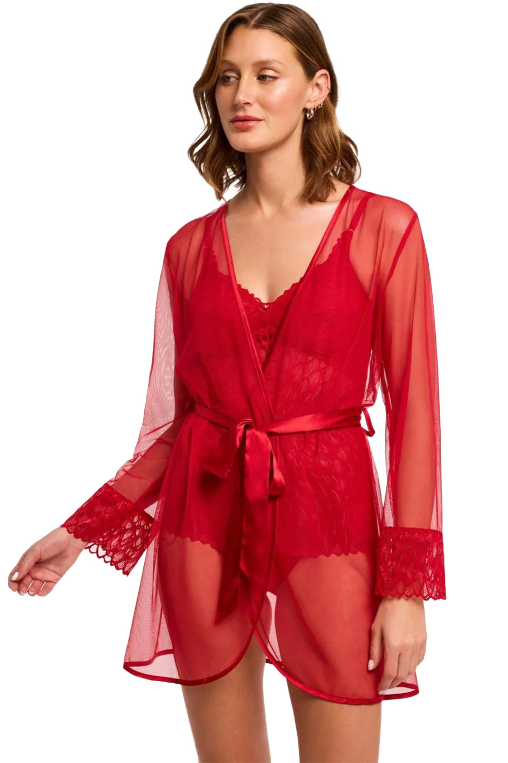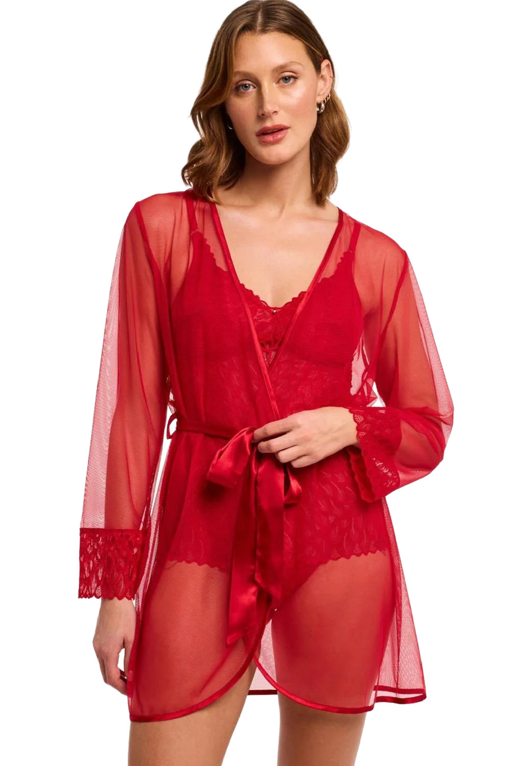 Montelle Lacy Essentials Cover Up in sweet red is ideal for lounging and getting ready in full glamour. This stunning mesh cover-up will elevate any lingerie set you choose to wear underneath.