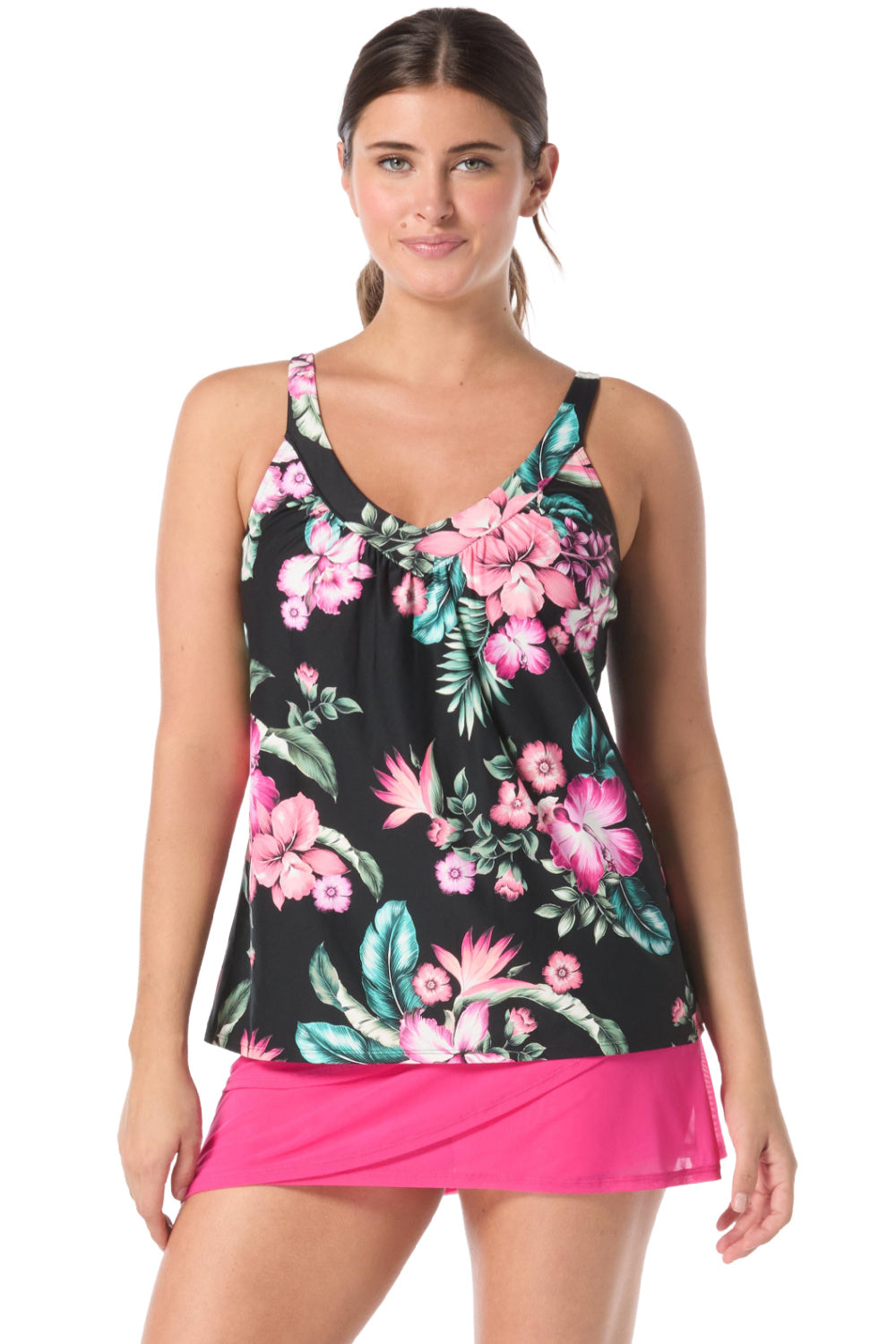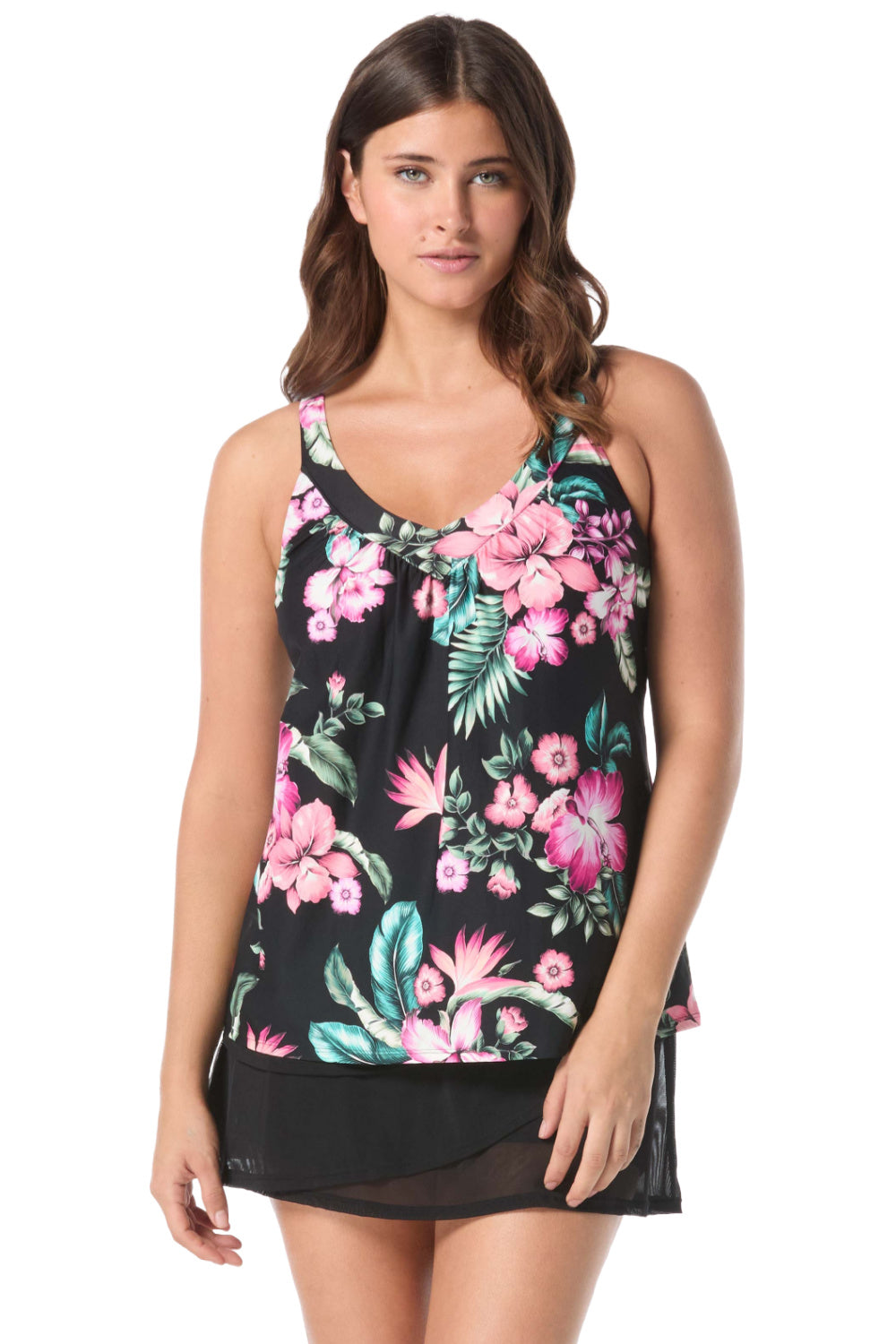 Chic style and feminine coverage come together in the Coco Reef Spiced Tropical Core V-Neck Bra Sized Underwire Tankini Top in black multi.